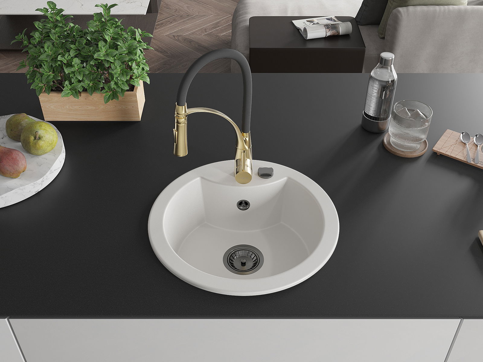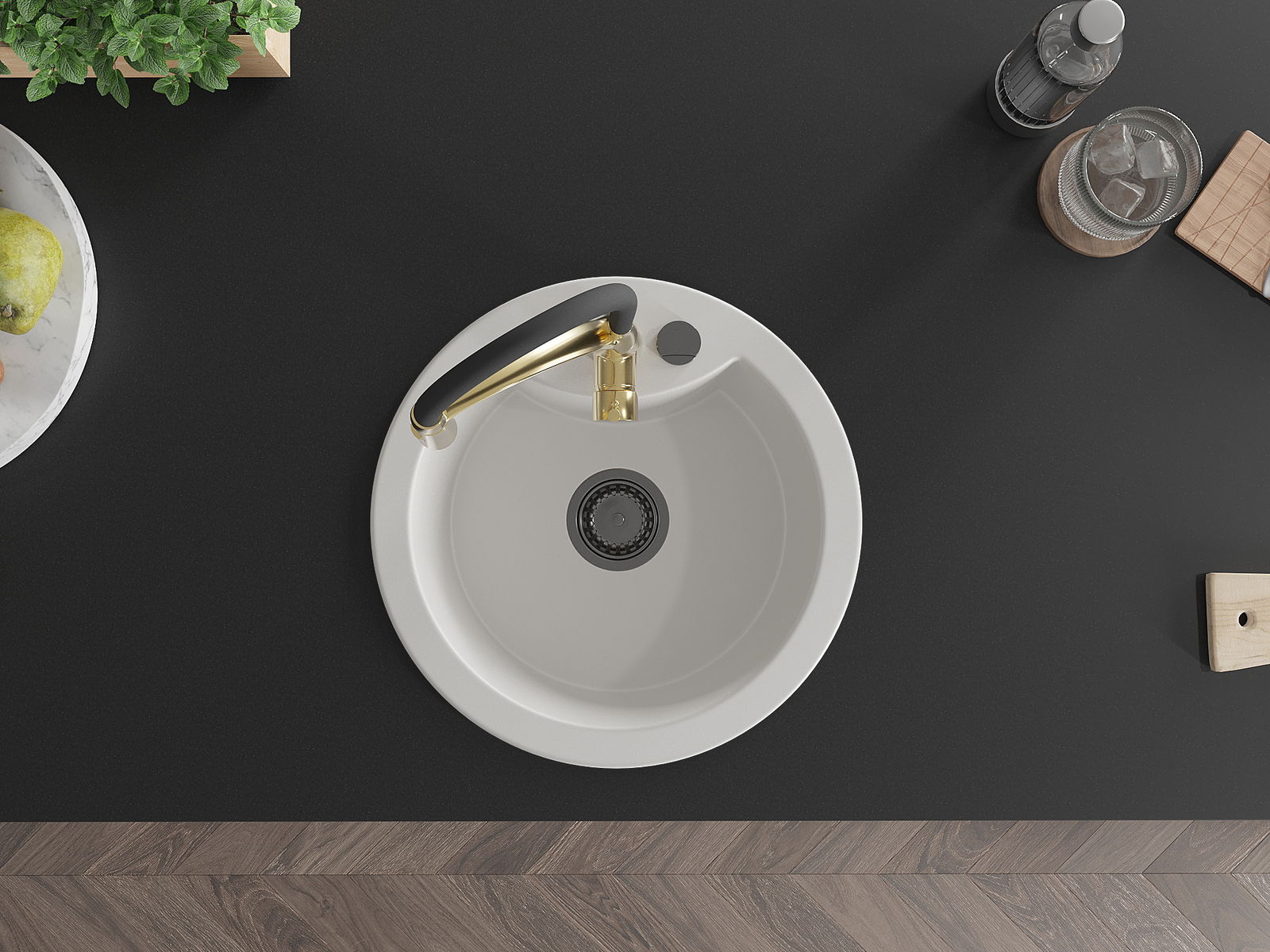 Zlew posiada podfrezowany otwór o średnicy 35 mm do samodzielnego wybicia. Można go wykorzystać m.in. do montażu dozownika na płyn, który wyeliminuje obecność plastikowych butelek w kuchni i nada jej eleganckiego wykończenia.