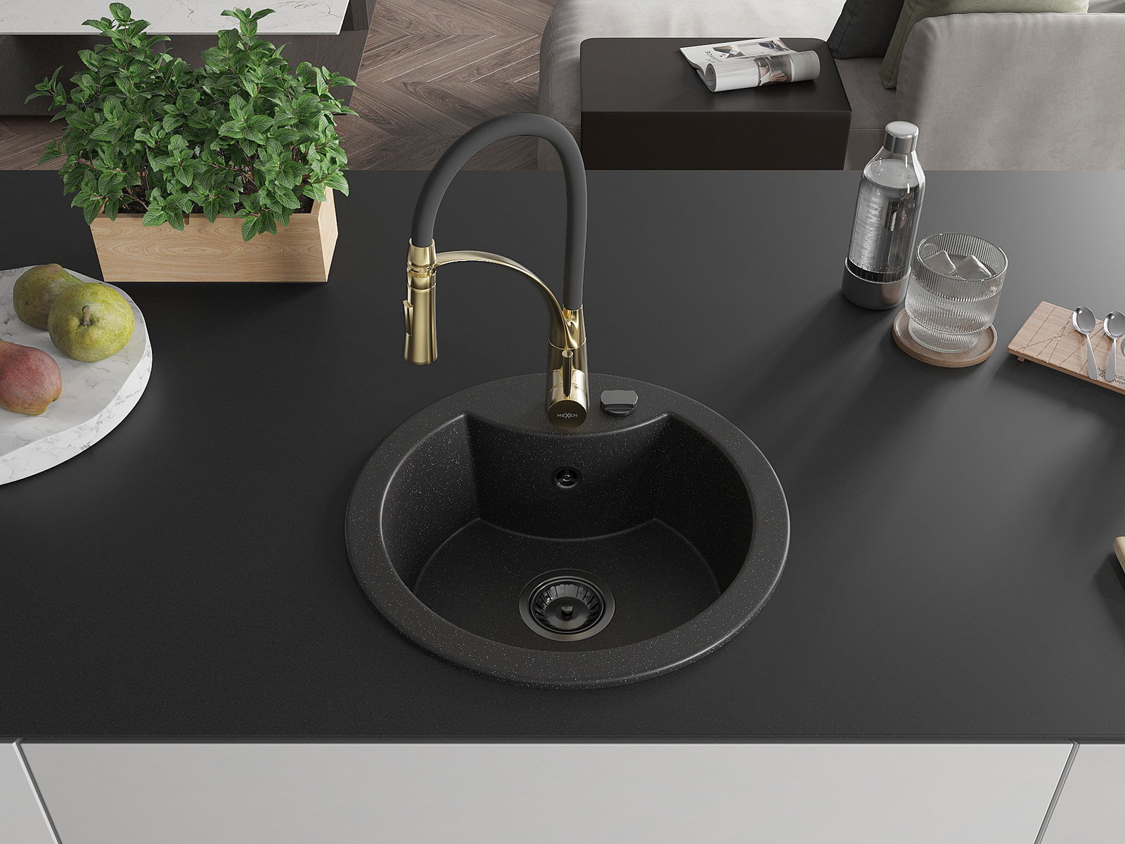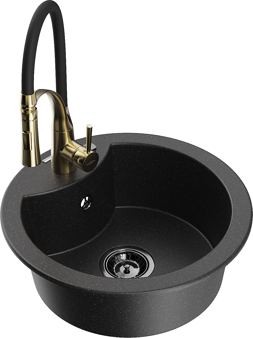 Mexen Diego zlewozmywak granitowy 1-komorowy z baterią kuchenną Aster, czarny/srebrny metalik - 6512-73-73450-57-B