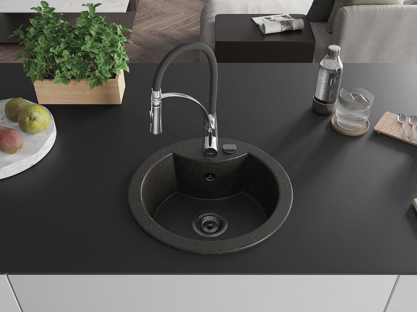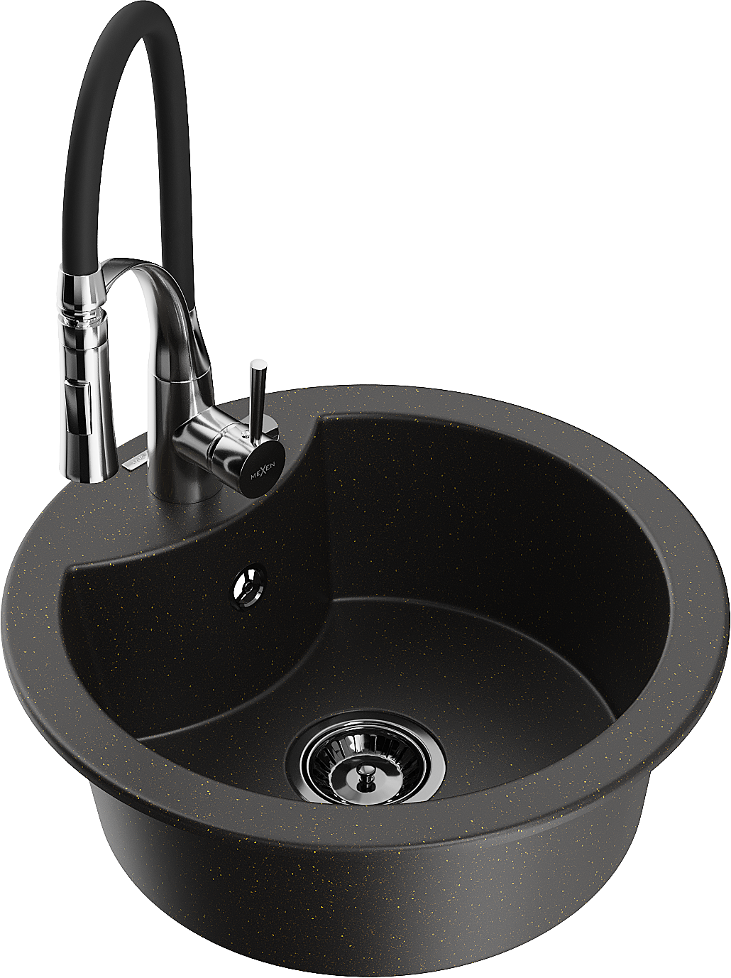 Mexen Diego zlewozmywak granitowy 1-komorowy z baterią kuchenną Aster, czarny/złoty metalik - 6512-75-73450-07-B