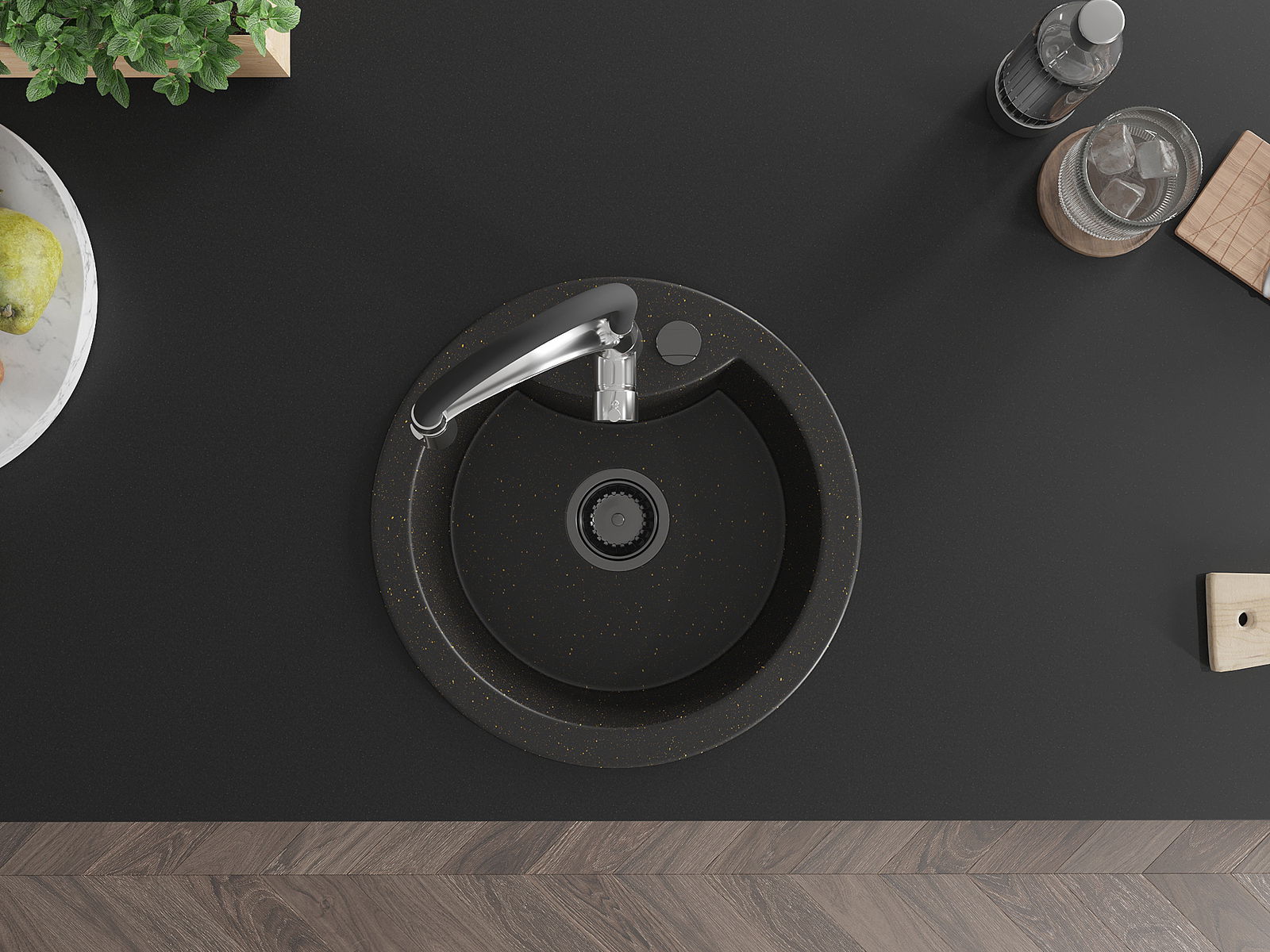 Zlew posiada podfrezowany otwór o średnicy 35 mm do samodzielnego wybicia. Można go wykorzystać m.in. do montażu dozownika na płyn, który wyeliminuje obecność plastikowych butelek w kuchni i nada jej eleganckiego wykończenia.