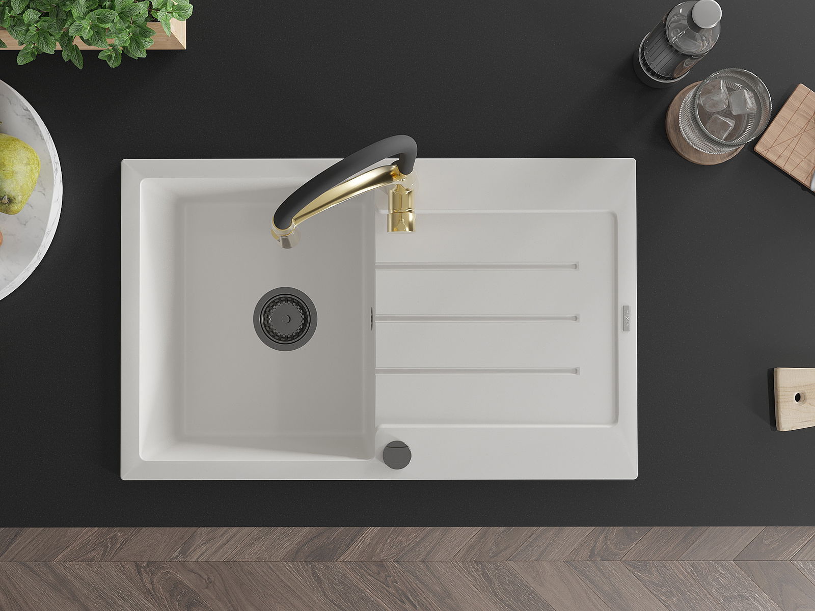 Mexen Bruno zlewozmywak granitowy 1-komorowy z ociekaczem i baterią kuchenną Aster, biały - 6513-20-73450-57-B