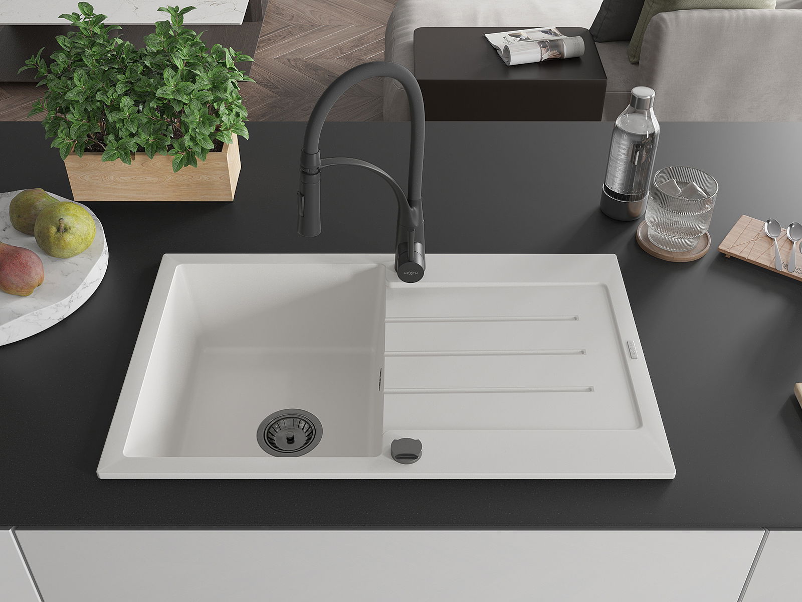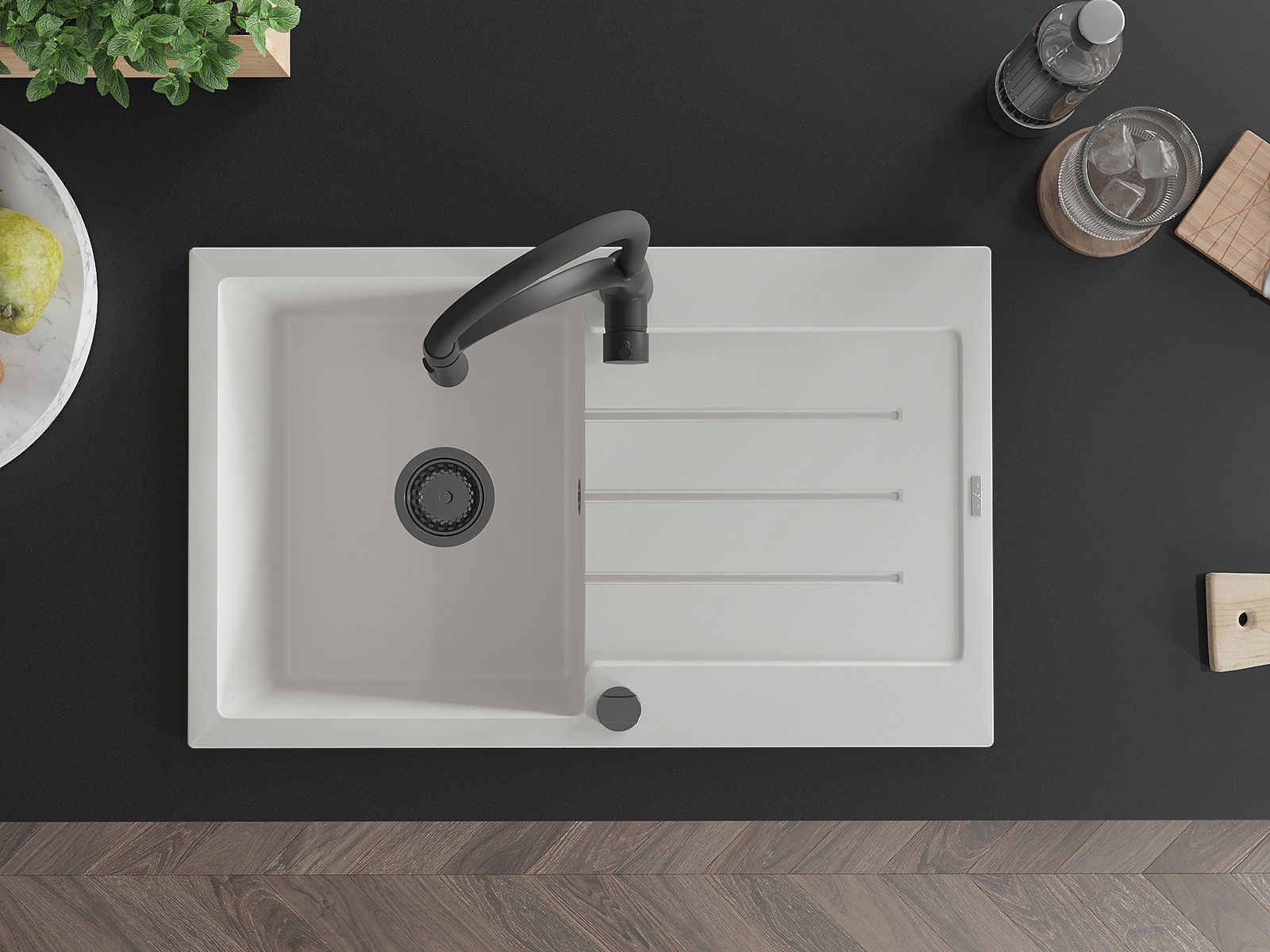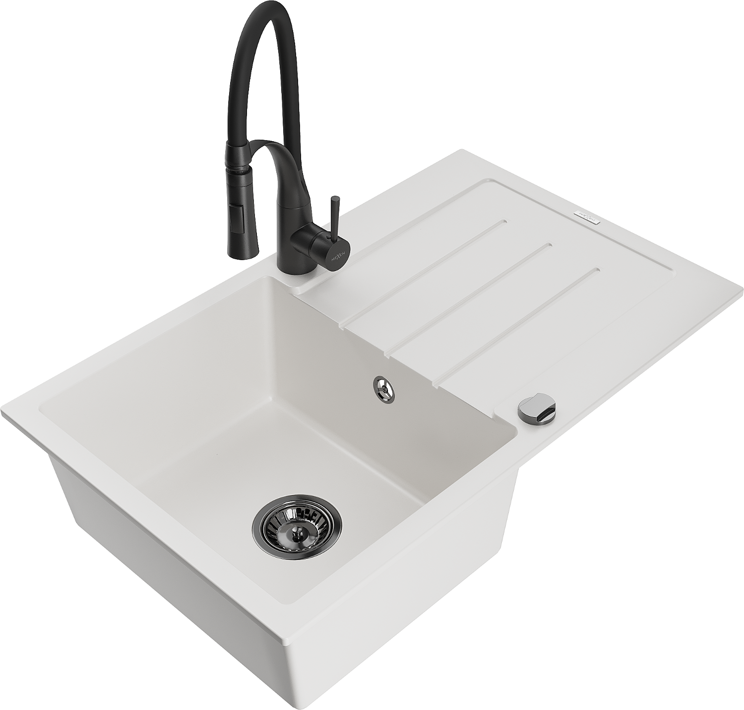 Mexen Bruno zlewozmywak granitowy 1-komorowy z ociekaczem i baterią kuchenną Aster, biały - 6513-20-73450-70-B