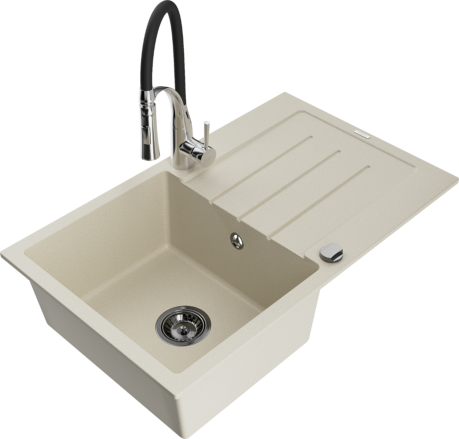Mexen Bruno zlewozmywak granitowy 1-komorowy z ociekaczem i baterią kuchenną Aster, beżowy - 6513-69-73450-07-B