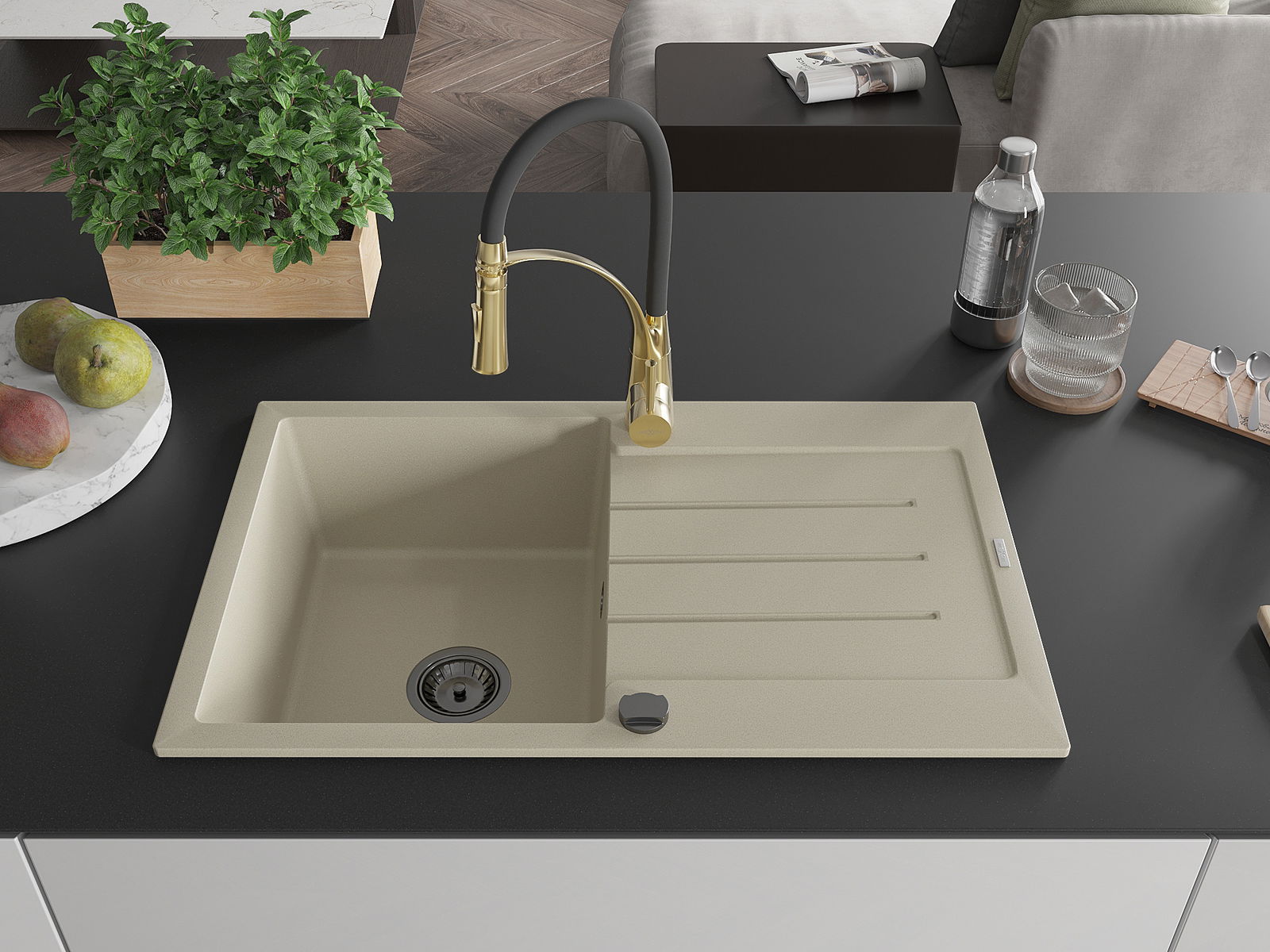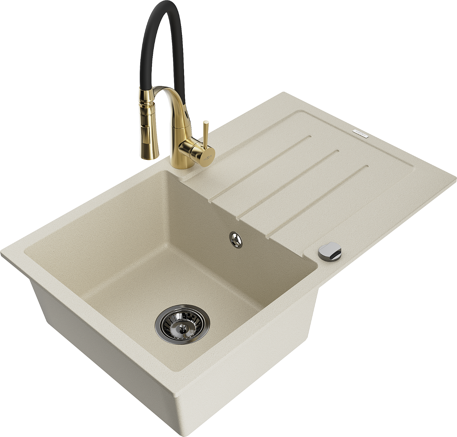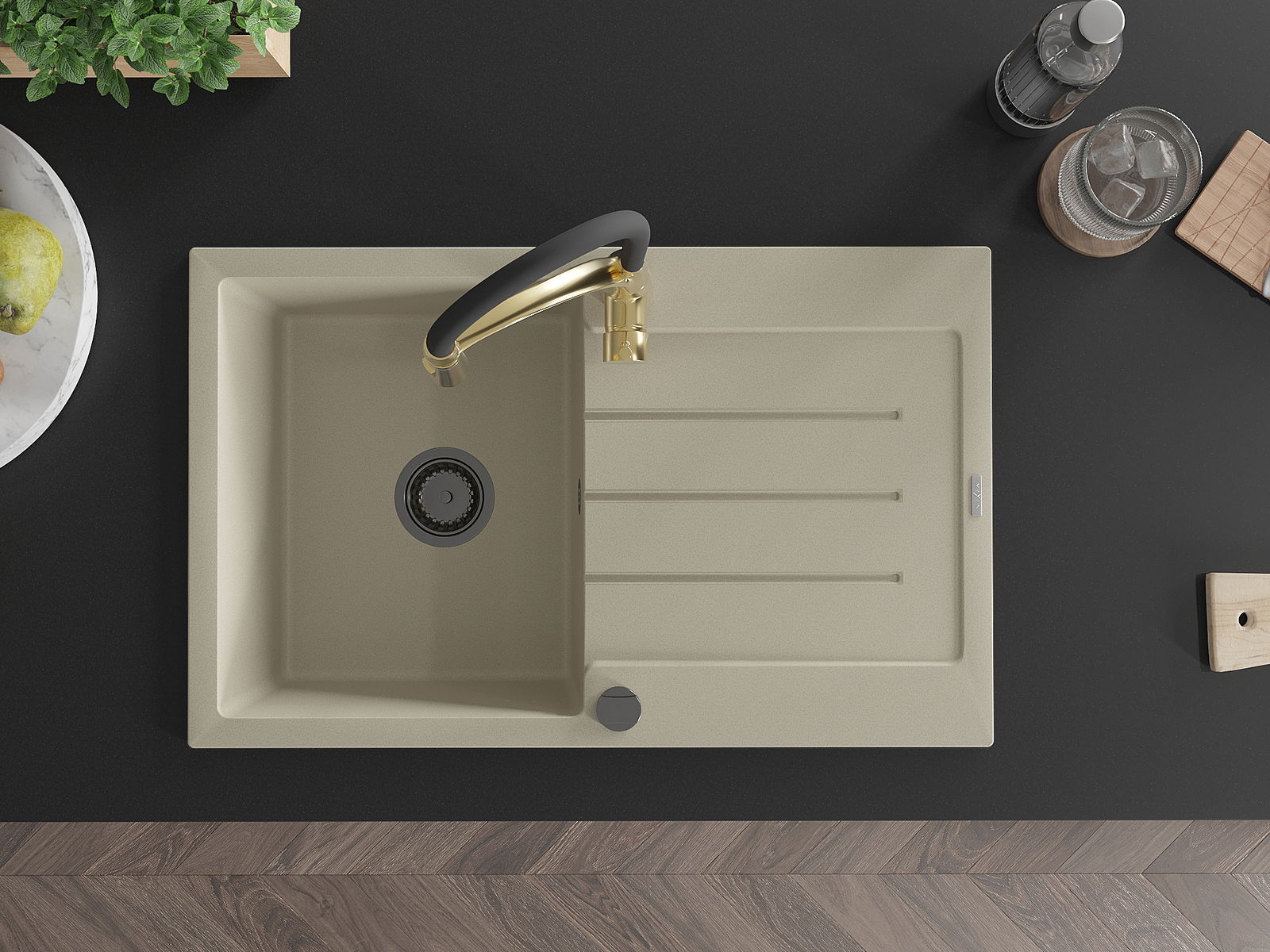 Mexen Bruno zlewozmywak granitowy 1-komorowy z ociekaczem i baterią kuchenną Aster, beżowy - 6513-69-73450-57-B