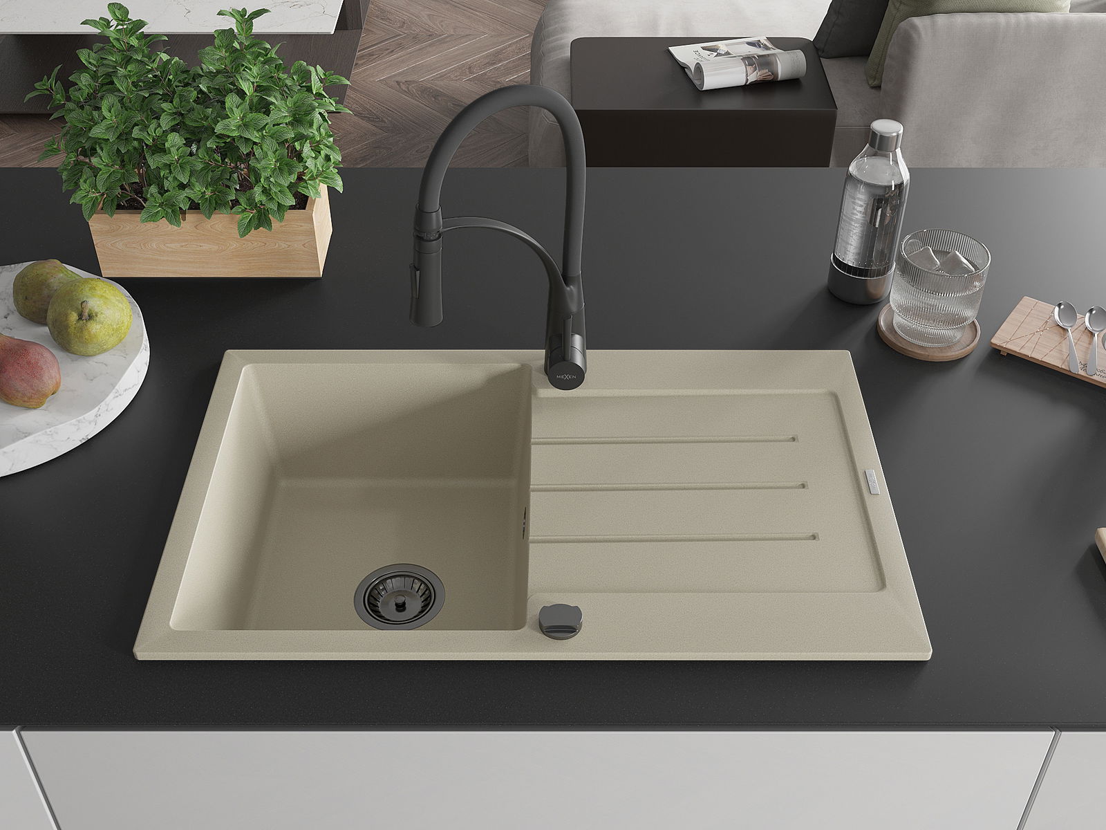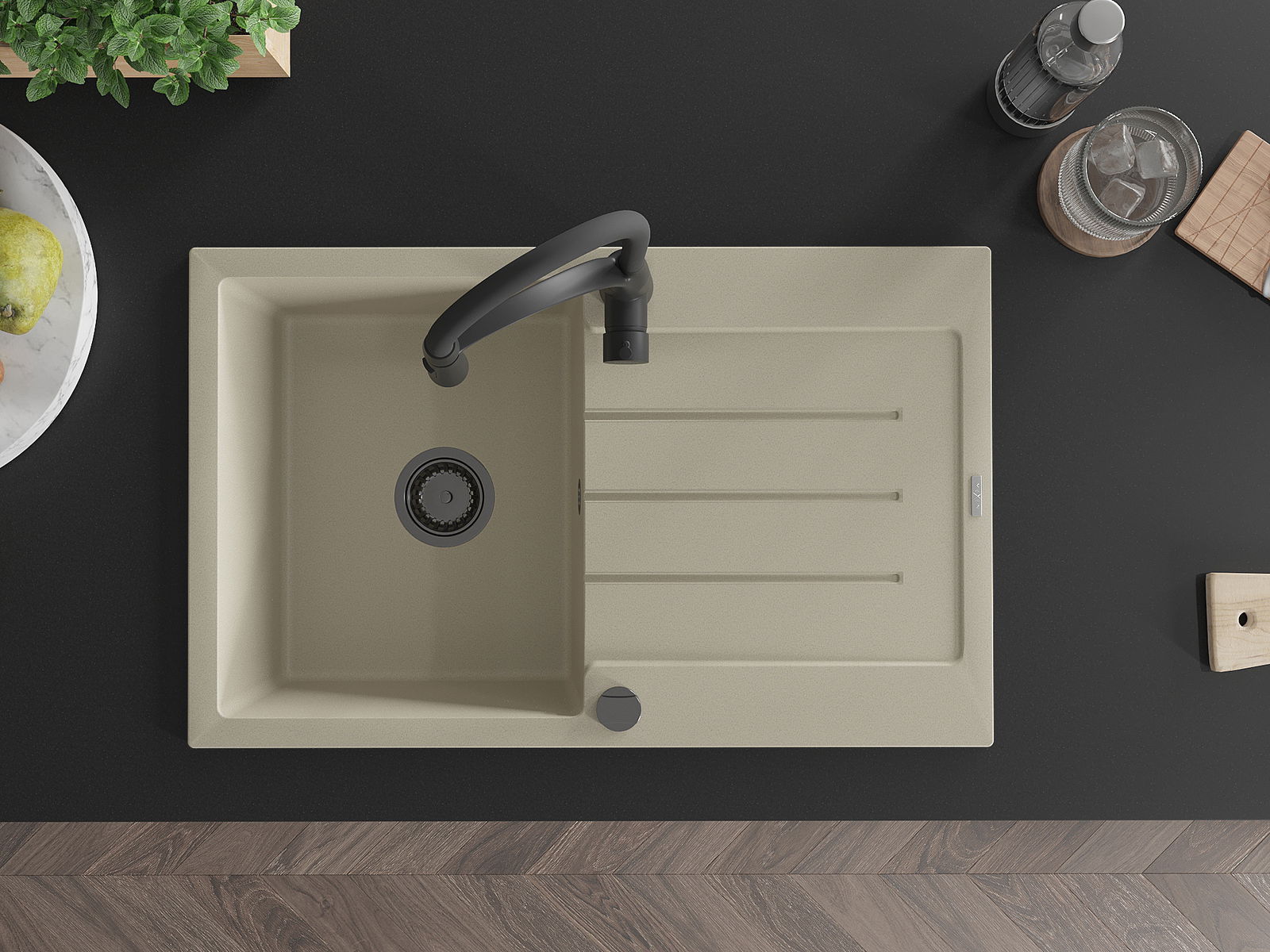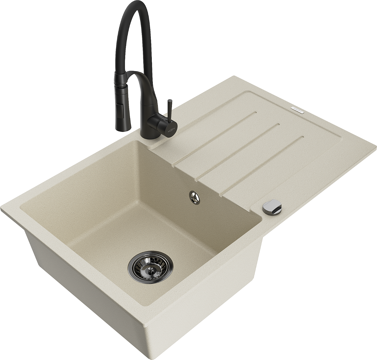 Mexen Bruno zlewozmywak granitowy 1-komorowy z ociekaczem i baterią kuchenną Aster, beżowy - 6513-69-73450-70-B