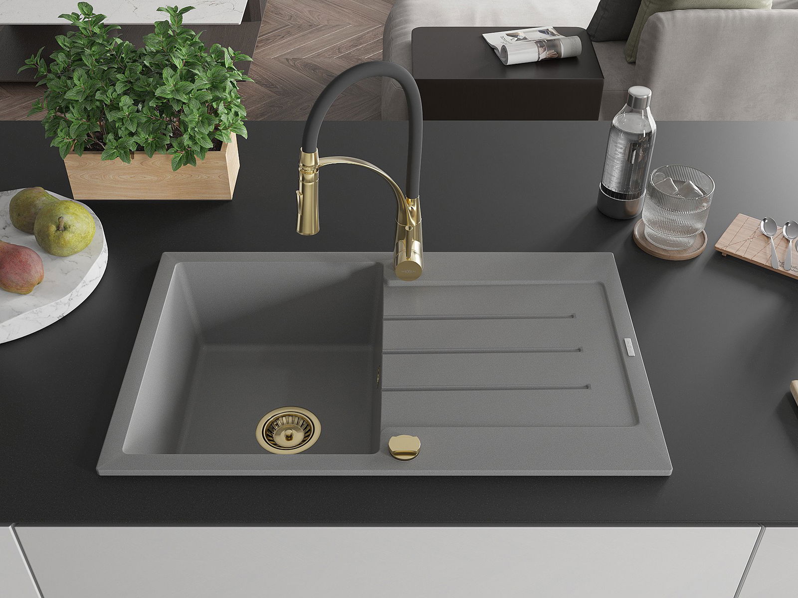 Mexen Bruno zlewozmywak granitowy 1-komorowy z ociekaczem i baterią kuchenną Aster, szary - 6513-71-73450-57-G