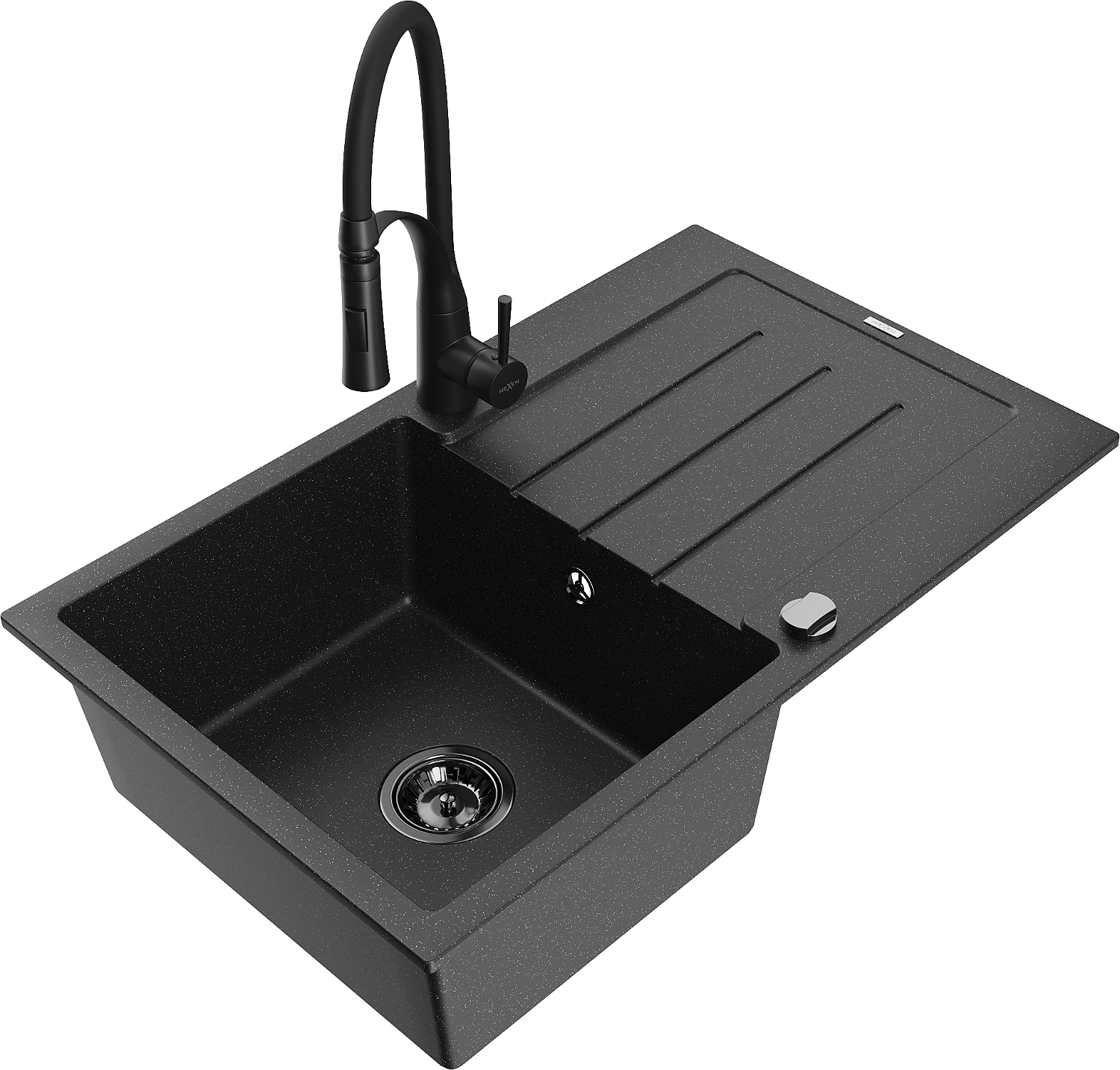 Mexen Bruno zlewozmywak granitowy 1-komorowy z ociekaczem i baterią kuchenną Aster, czarny/srebrny metalik - 6513-73-73450-70-B