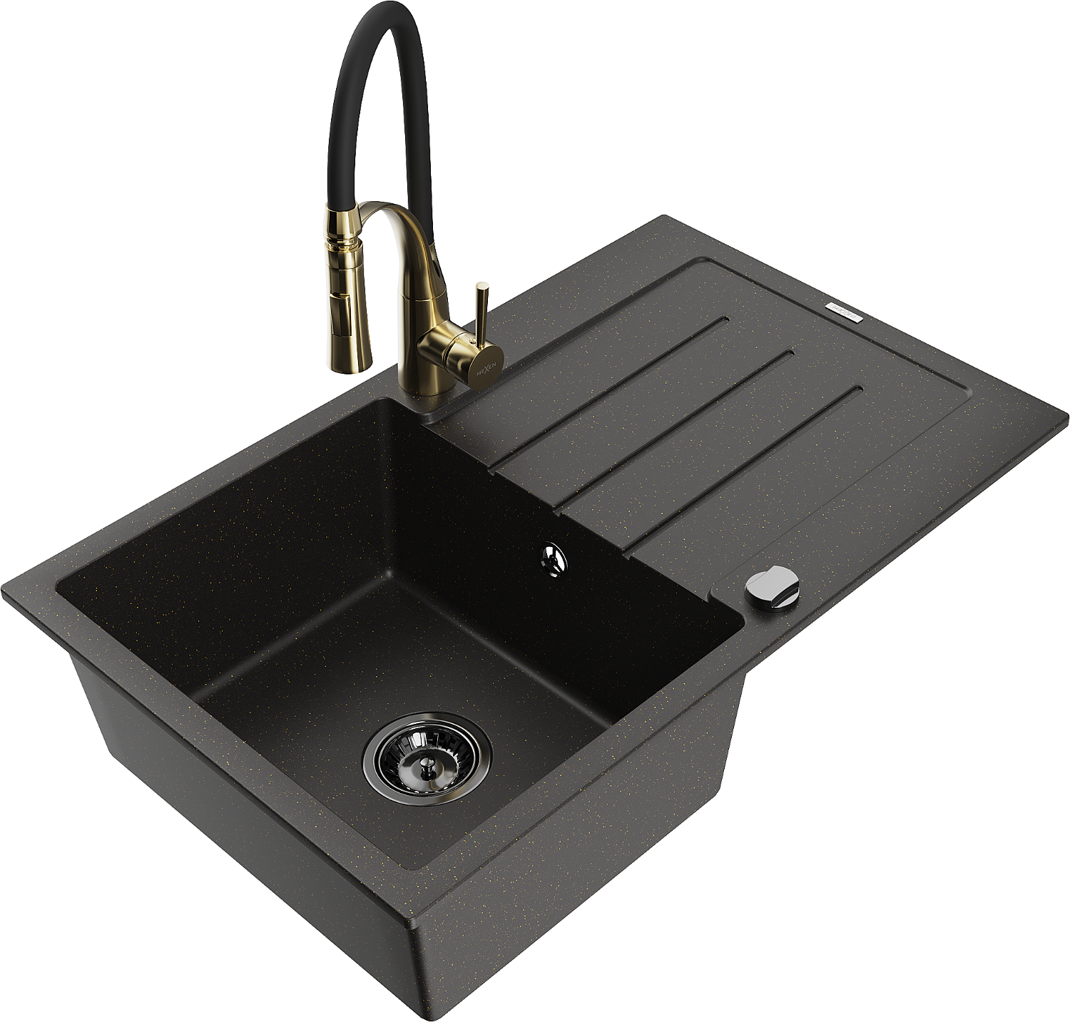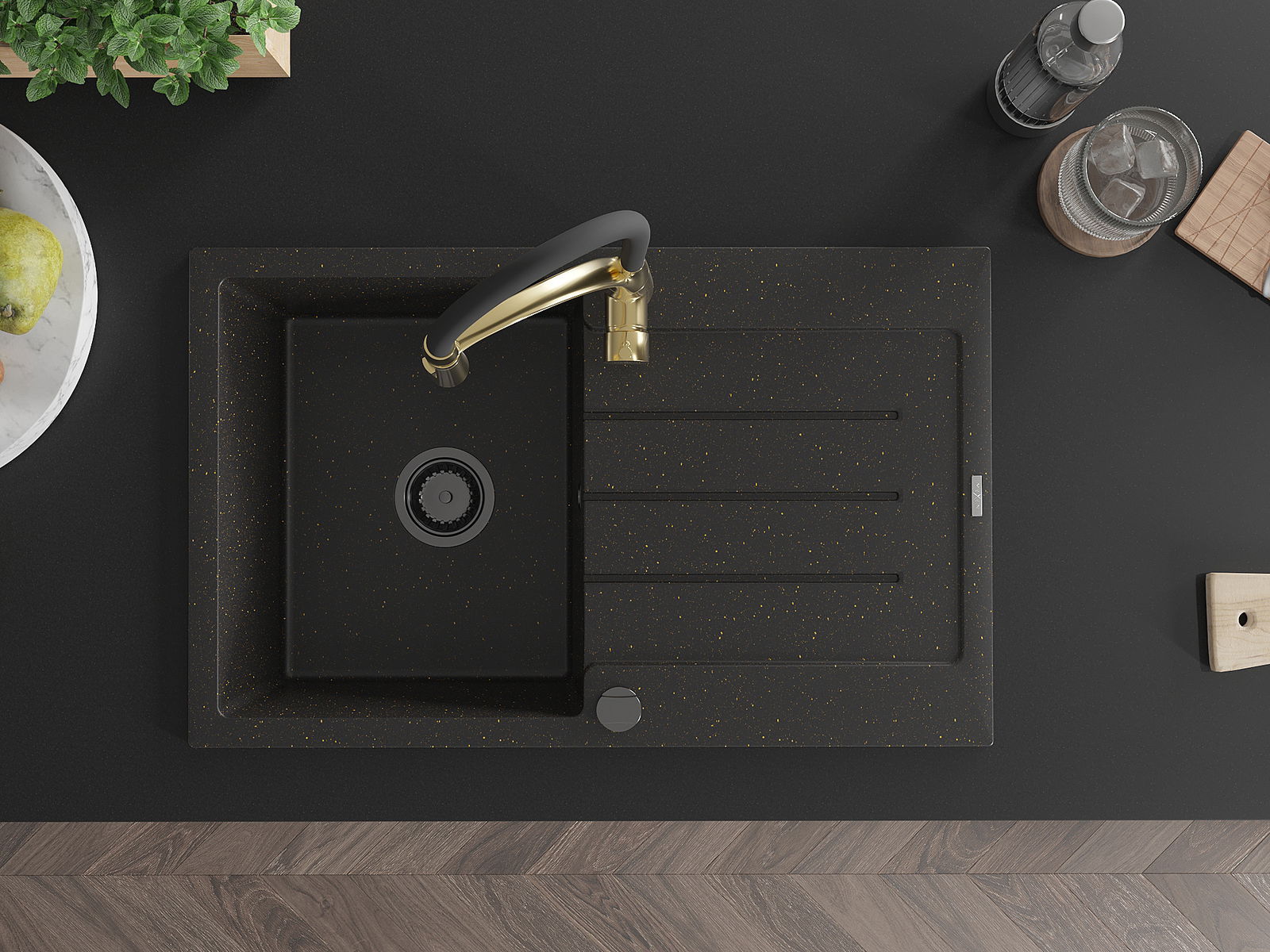 Mexen Bruno zlewozmywak granitowy 1-komorowy z ociekaczem i baterią kuchenną Aster, czarny/złoty metalik - 6513-75-73450-57-B