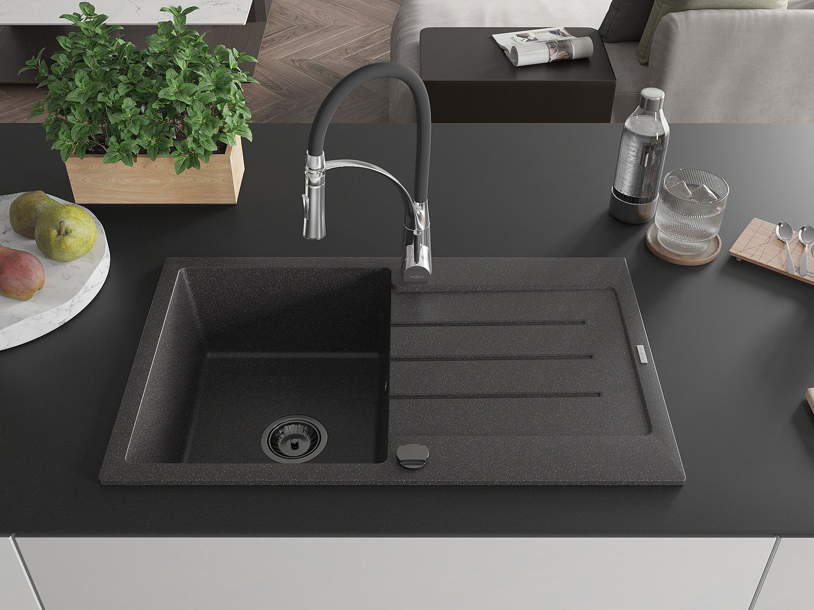 Mexen Bruno zlewozmywak granitowy 1-komorowy z ociekaczem i baterią kuchenną Aster, czarny nakrapiany - 6513-76-73450-07-B