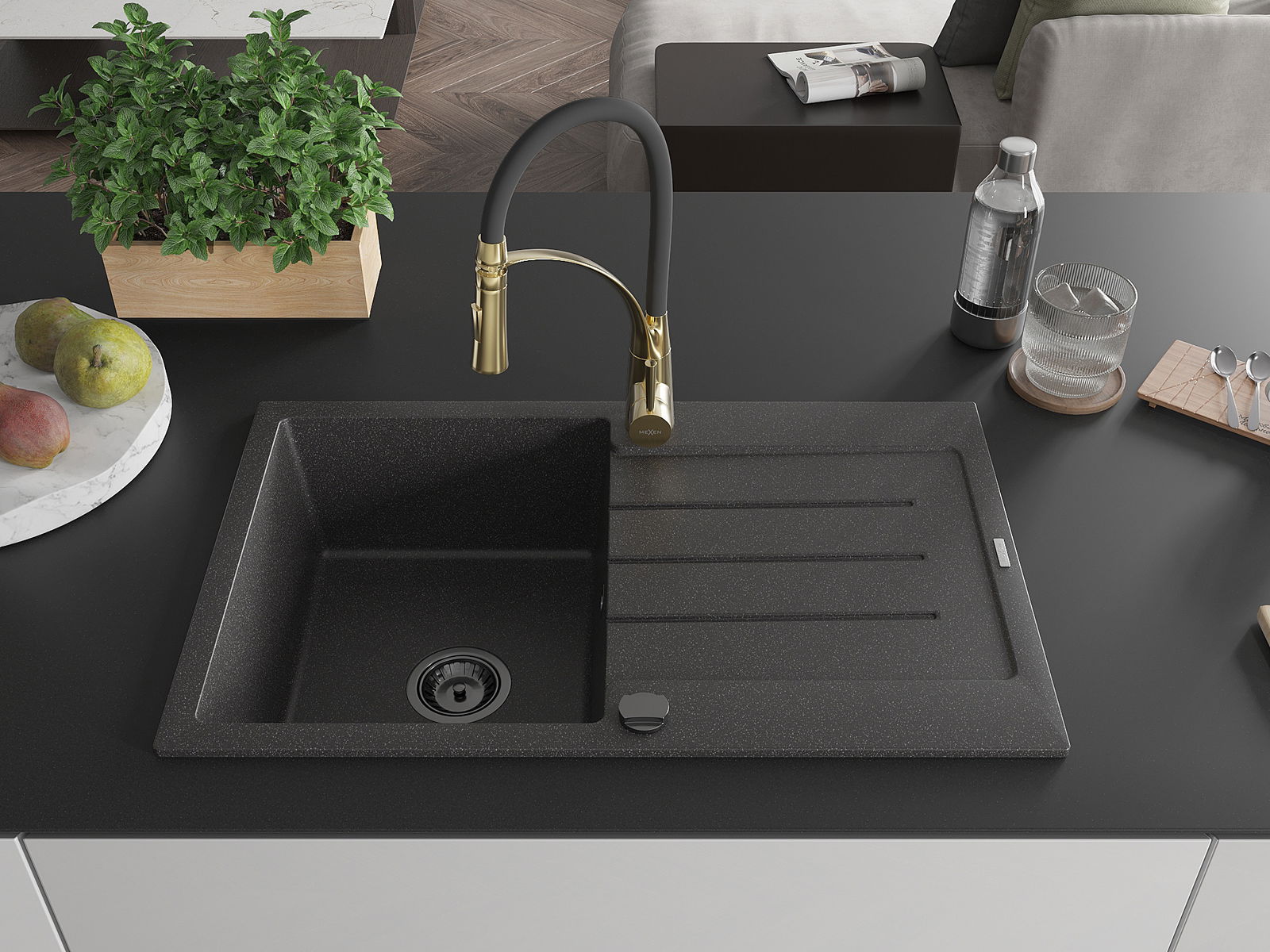 Mexen Bruno zlewozmywak granitowy 1-komorowy z ociekaczem i baterią kuchenną Aster, czarny nakrapiany - 6513-76-73450-57-B