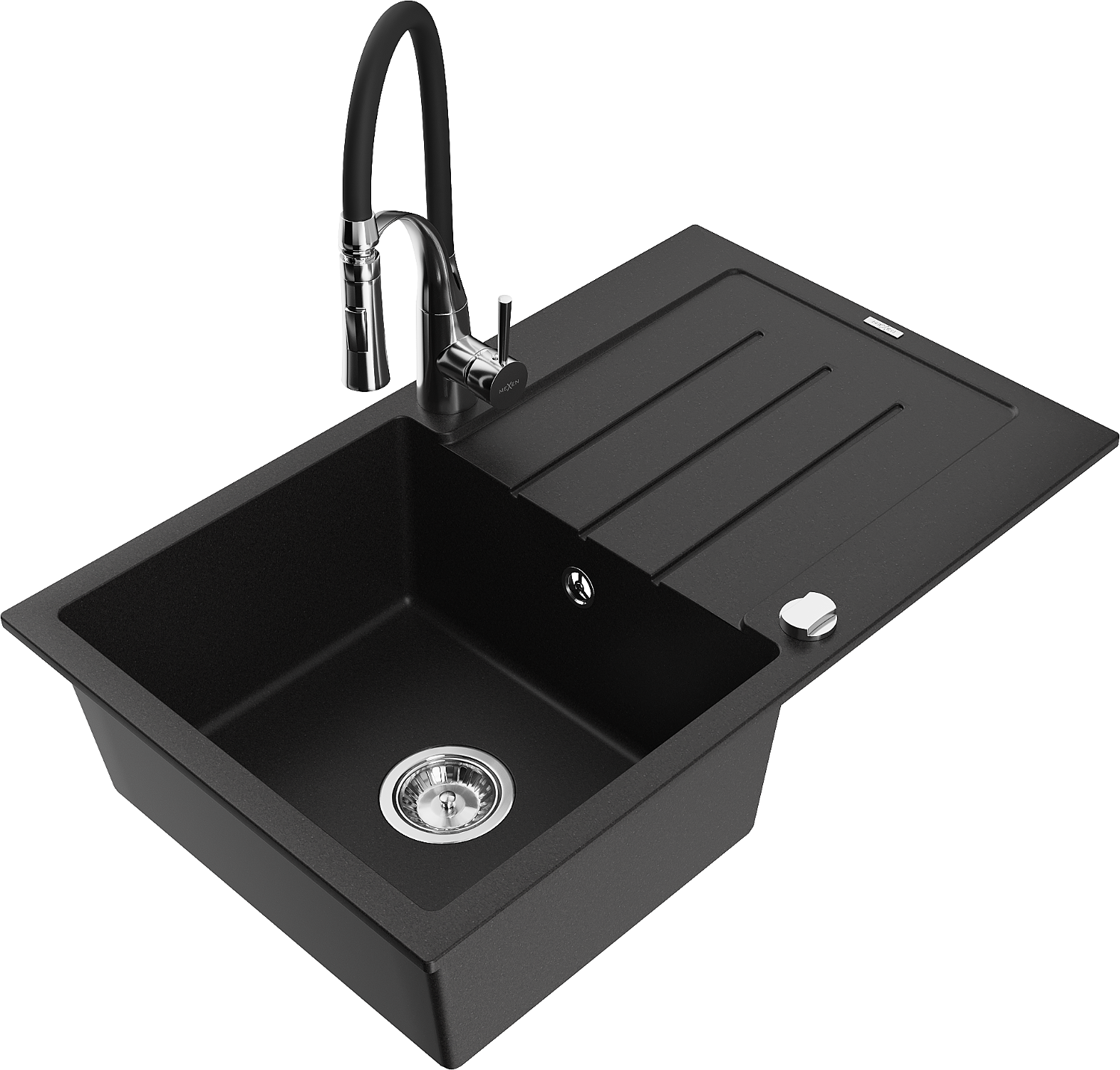 Mexen Bruno zlewozmywak granitowy 1-komorowy z ociekaczem i baterią kuchenną Aster, czarny - 6513-77-73450-07