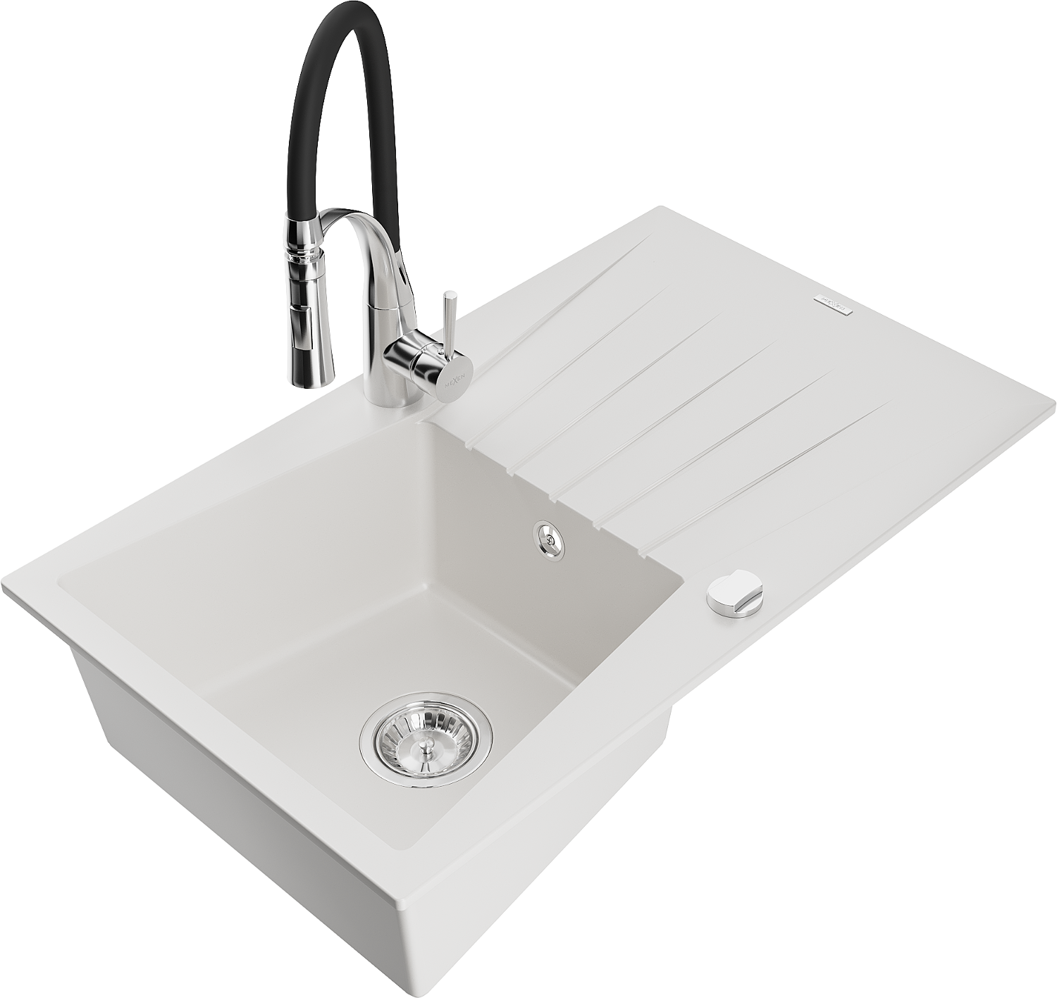 Mexen Cesar zlewozmywak granitowy 1-komorowy z ociekaczem i baterią kuchenną Aster, biały - 6514-20-73450-07