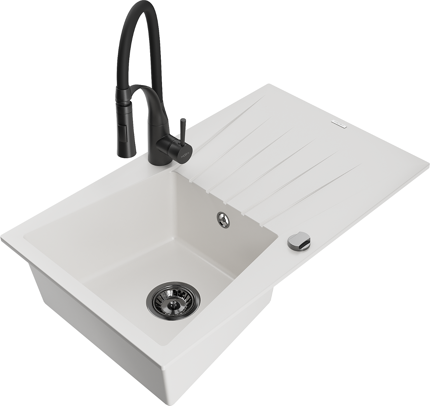 Mexen Cesar zlewozmywak granitowy 1-komorowy z ociekaczem i baterią kuchenną Aster, biały - 6514-20-73450-70-B
