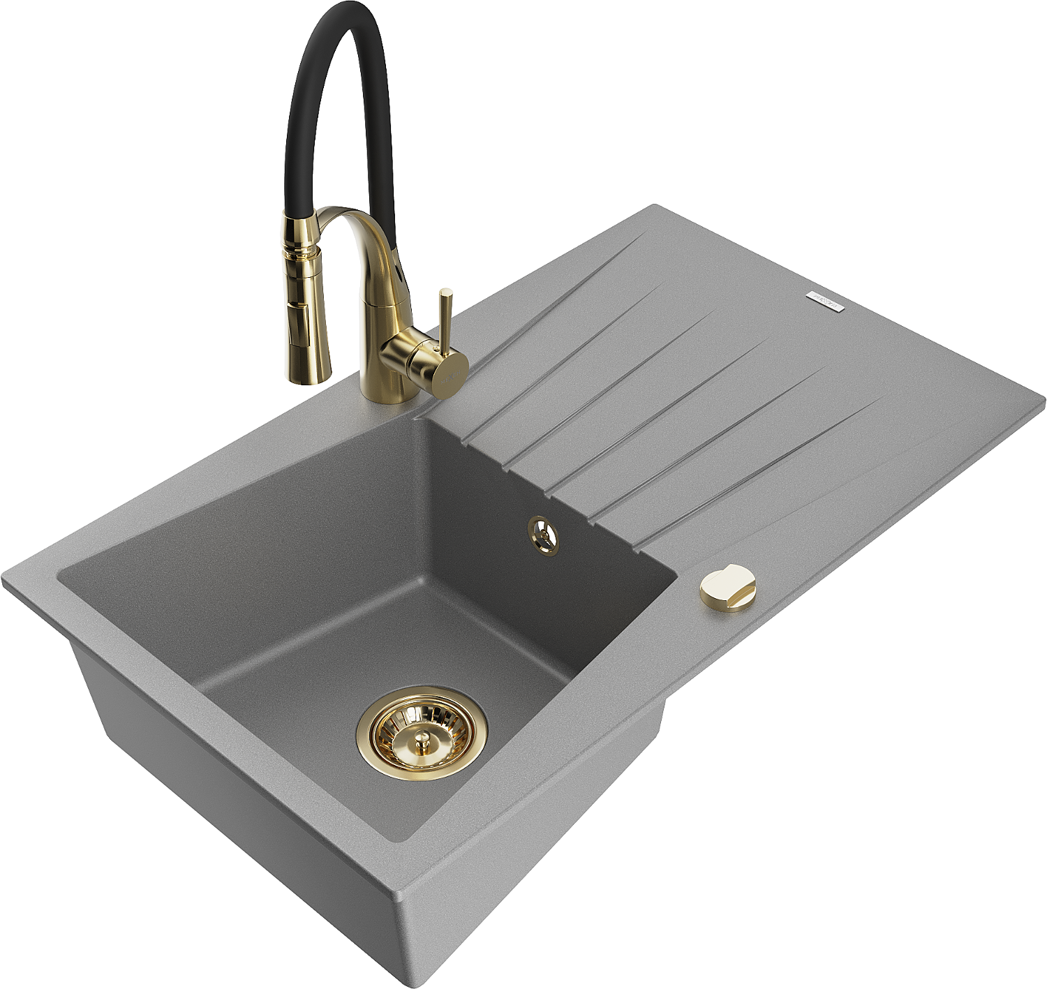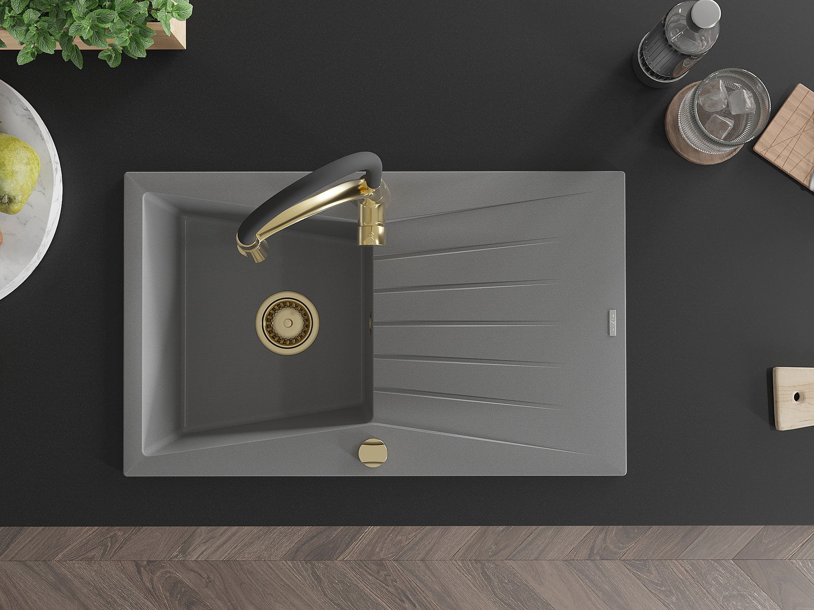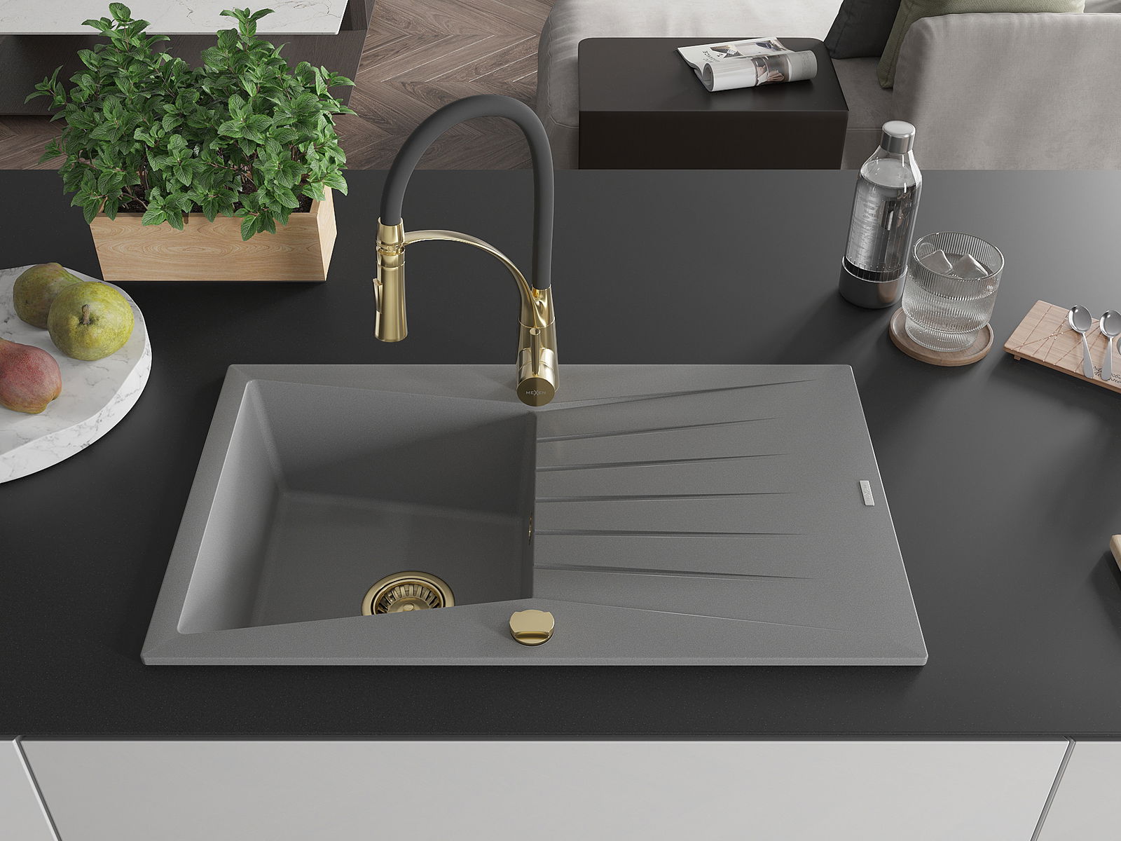 Mexen Cesar zlewozmywak granitowy 1-komorowy z ociekaczem i baterią kuchenną Aster, szary - 6514-71-73450-57-G