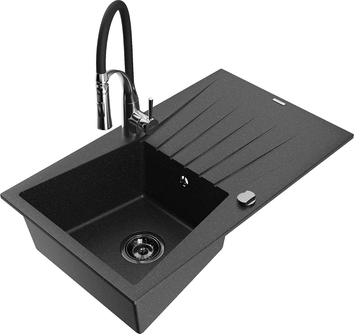 Mexen Cesar zlewozmywak granitowy 1-komorowy z ociekaczem i baterią kuchenną Aster, czarny/srebrny metalik - 6514-73-73450-07-B