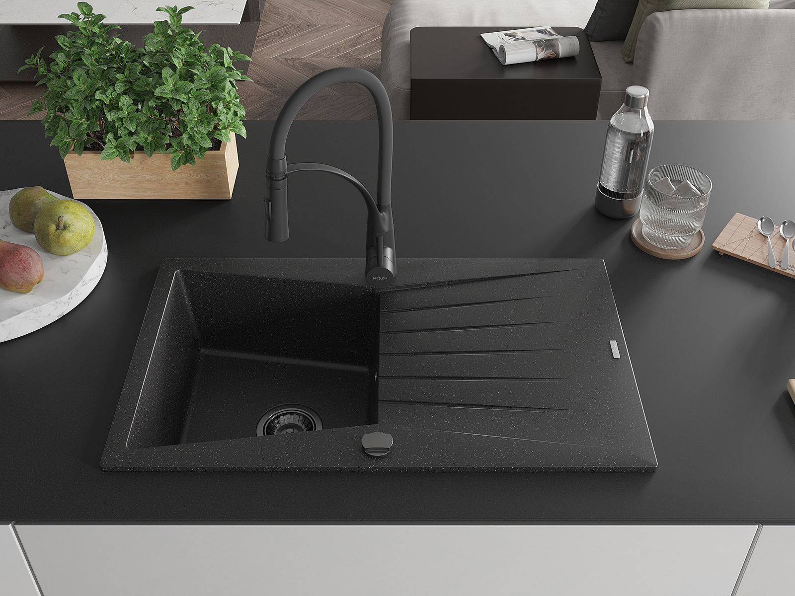 Mexen Cesar zlewozmywak granitowy 1-komorowy z ociekaczem i baterią kuchenną Aster, czarny/srebrny metalik - 6514-73-73450-70-B