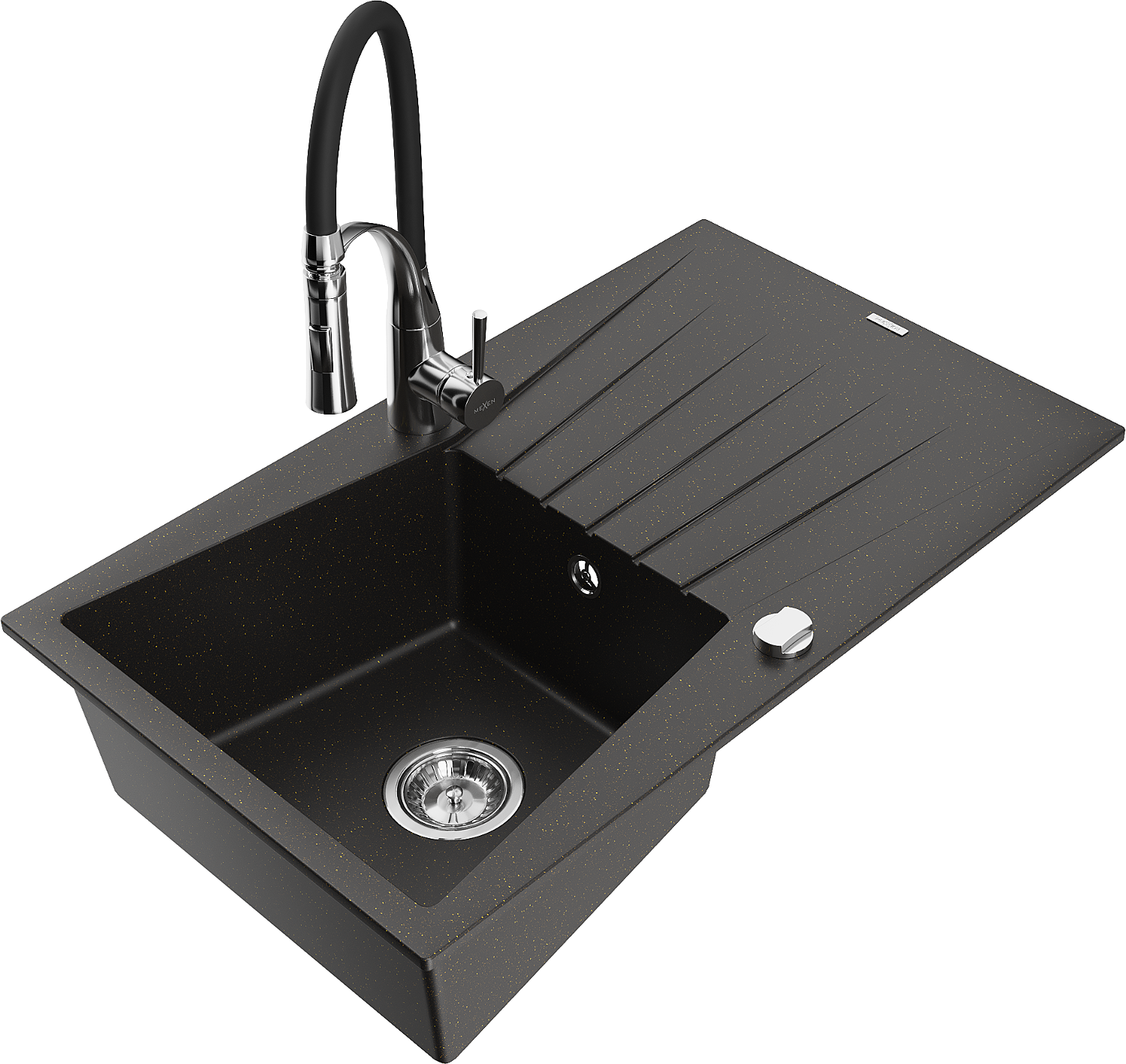 Mexen Cesar zlewozmywak granitowy 1-komorowy z ociekaczem i baterią kuchenną Aster, czarny/złoty metalik - 6514-75-73450-07