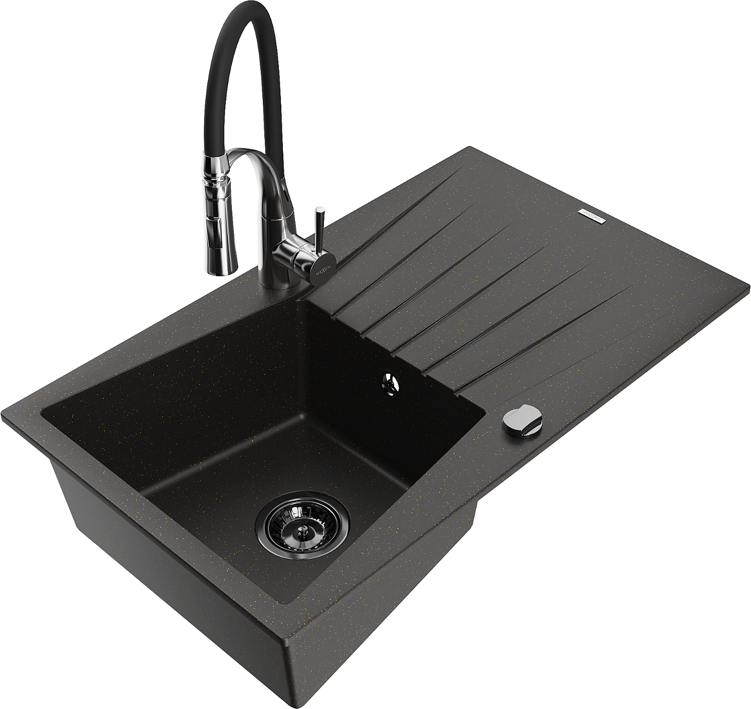 Mexen Cesar zlewozmywak granitowy 1-komorowy z ociekaczem i baterią kuchenną Aster, czarny/złoty metalik - 6514-75-73450-07-B