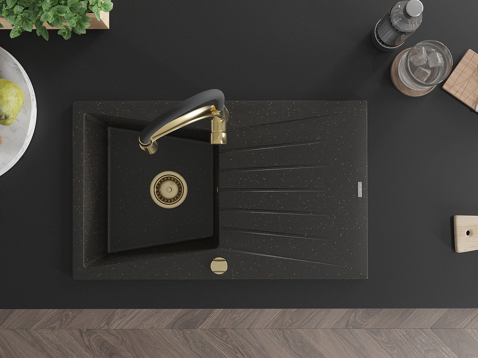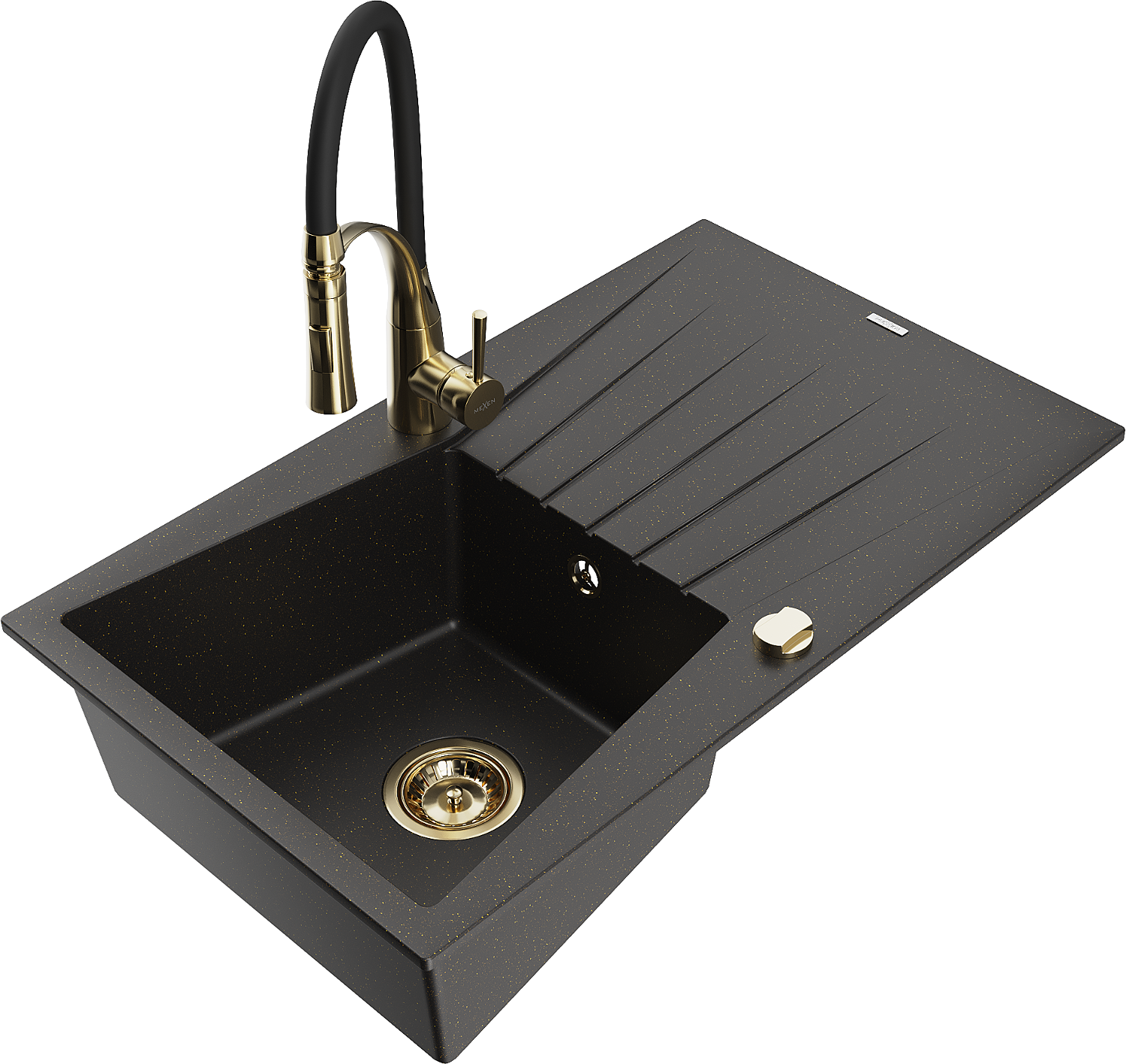 Mexen Cesar zlewozmywak granitowy 1-komorowy z ociekaczem i baterią kuchenną Aster, czarny/złoty metalik - 6514-75-73450-57-G