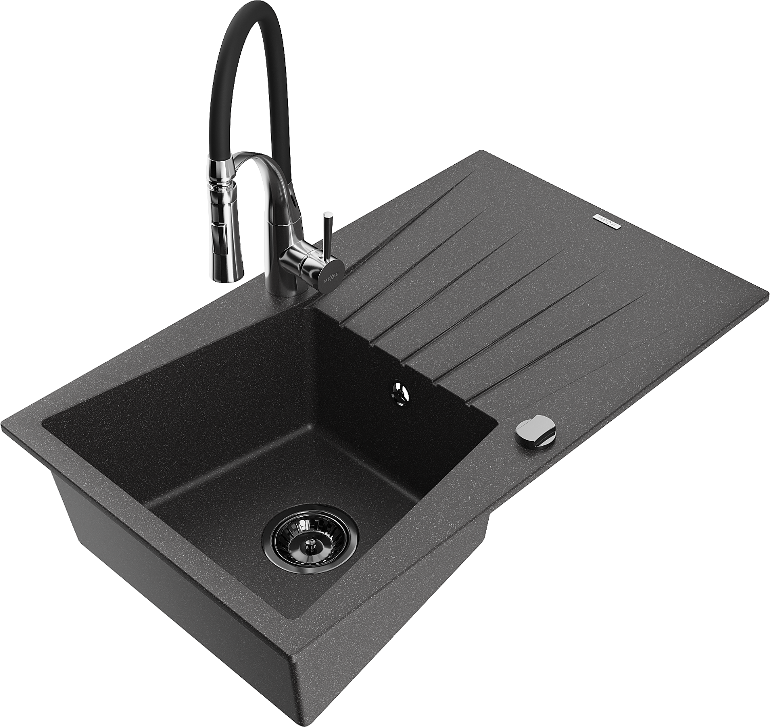 Mexen Cesar zlewozmywak granitowy 1-komorowy z ociekaczem i baterią kuchenną Aster, czarny nakrapiany - 6514-76-73450-07-B
