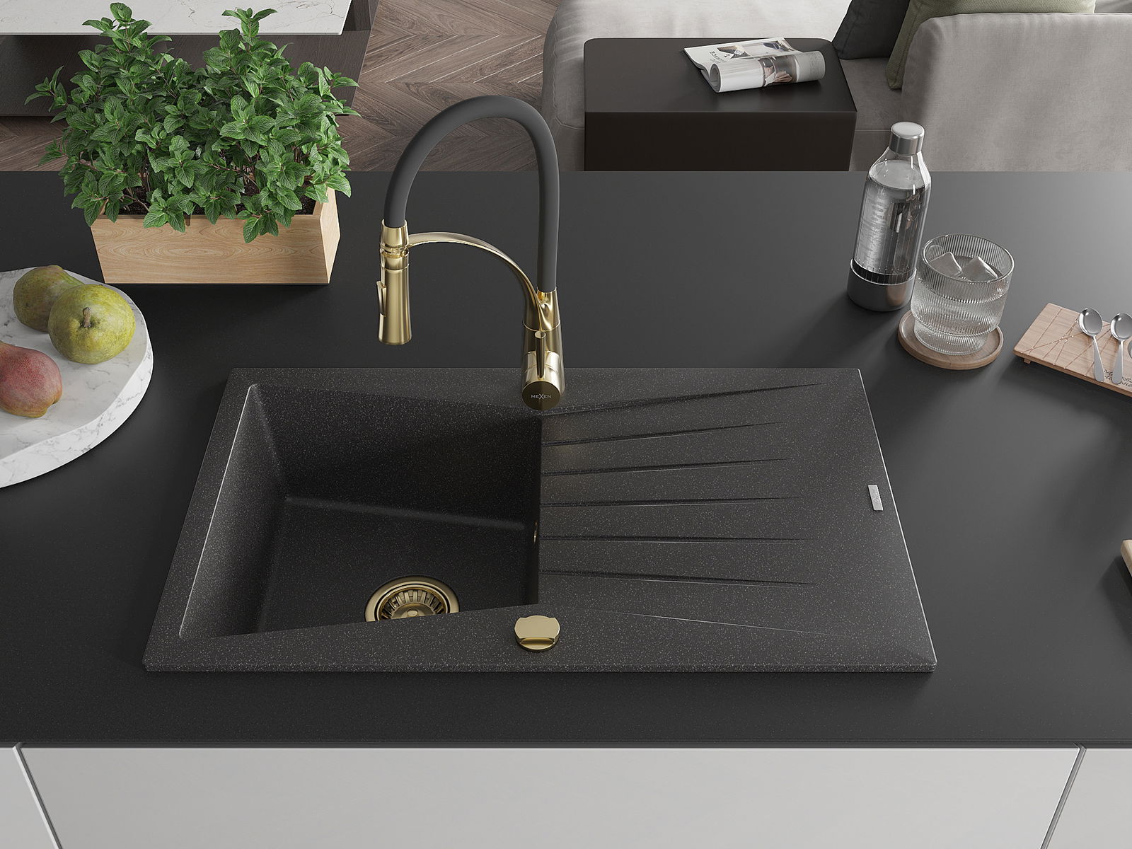 Mexen Cesar zlewozmywak granitowy 1-komorowy z ociekaczem i baterią kuchenną Aster, czarny nakrapiany - 6514-76-73450-57-G