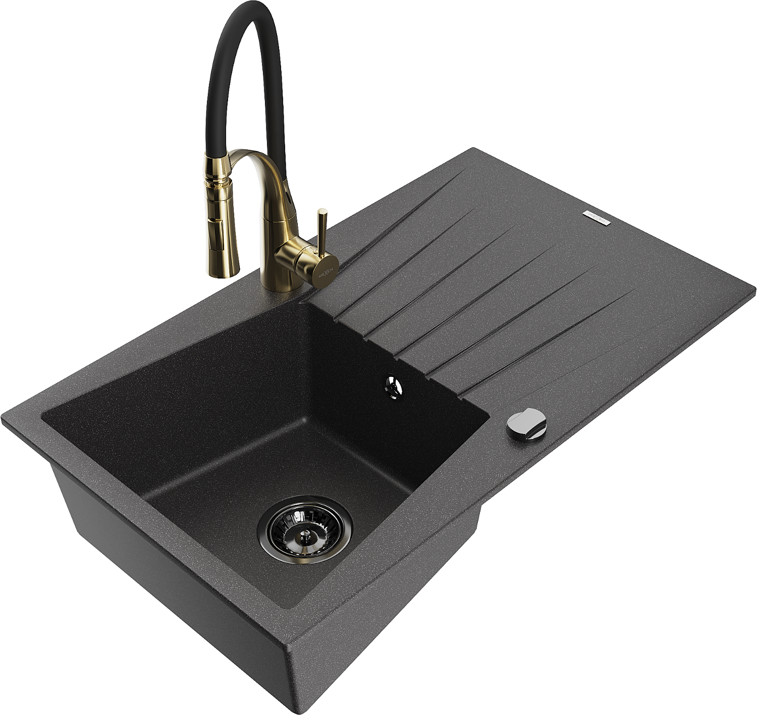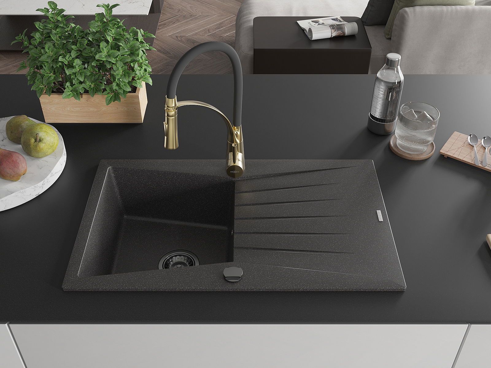 Mexen Cesar zlewozmywak granitowy 1-komorowy z ociekaczem i baterią kuchenną Aster, czarny nakrapiany - 6514-76-73450-57-B