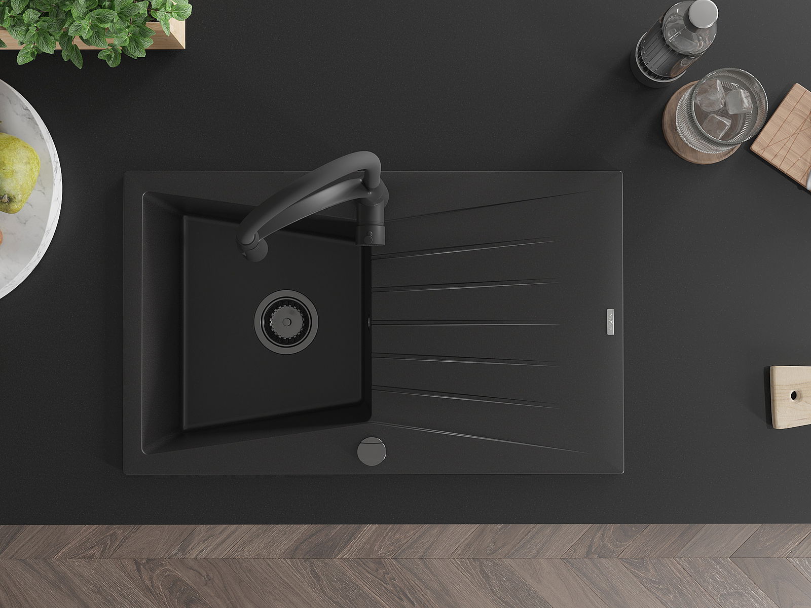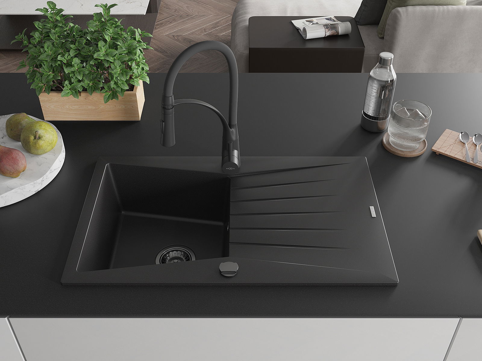Mexen Cesar zlewozmywak granitowy 1-komorowy z ociekaczem i baterią kuchenną Aster, czarny - 6514-77-73450-70-B