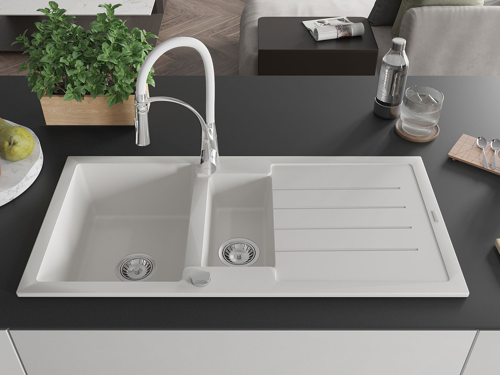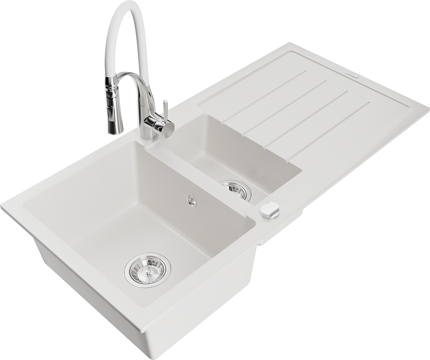 Mexen Andres zlewozmywak granitowy 1,5-komorowy z ociekaczem i baterią kuchenną Aster, biały - 6515-20-73450-02