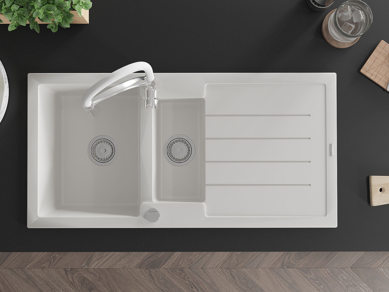 Dzięki zastosowaniu uniwersalnego systemu mocowania, zlew jest odwracalny, a ociekacz może zostać zamontowany na blacie po lewej lub prawej stronie. W ten sposób możesz z łatwością dopasować stronę do swoich potrzeb i warunków.