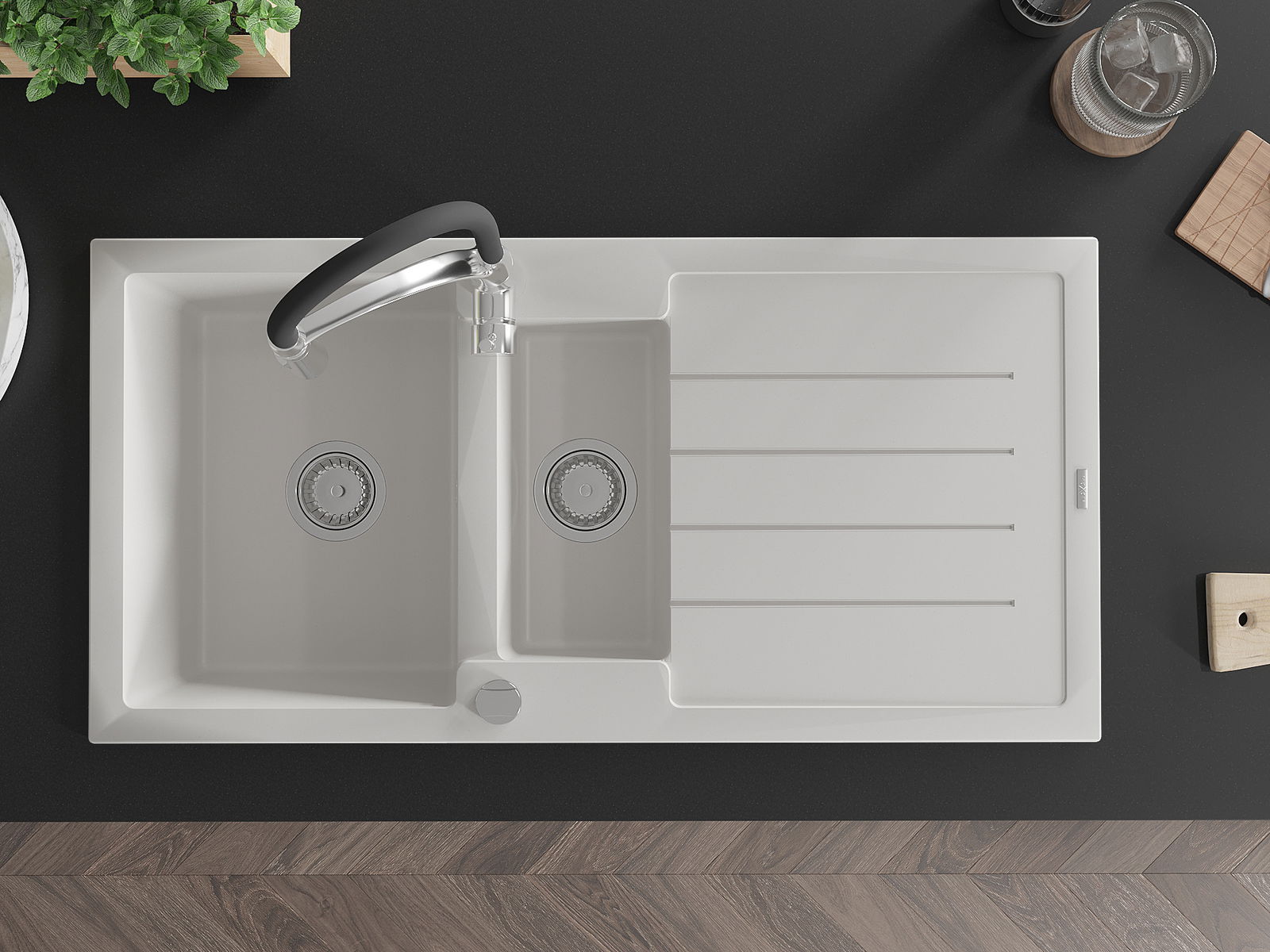 Dzięki zastosowaniu uniwersalnego systemu mocowania, zlew jest odwracalny, a ociekacz może zostać zamontowany na blacie po lewej lub prawej stronie. W ten sposób możesz z łatwością dopasować stronę do swoich potrzeb i warunków.