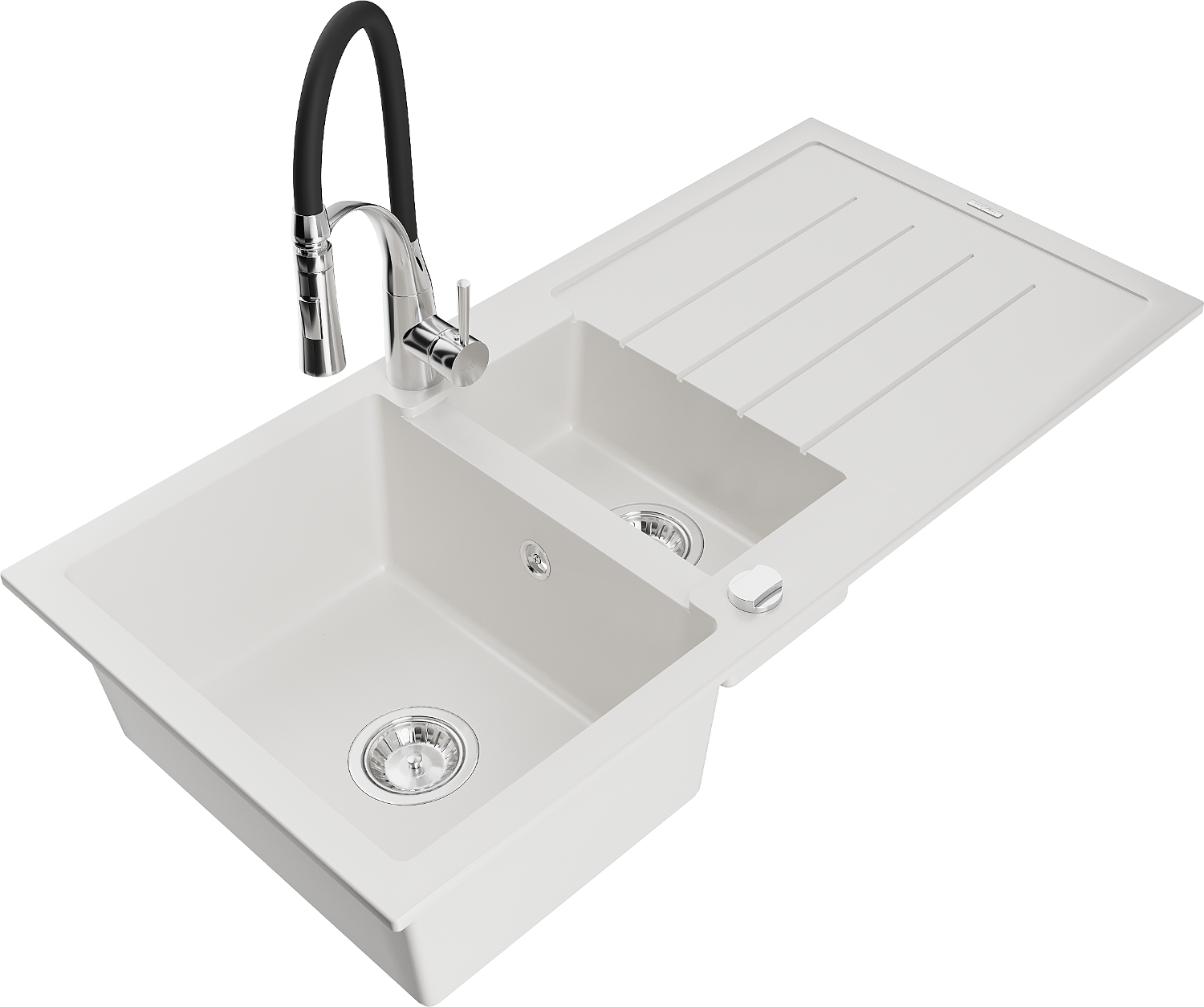 Mexen Andres zlewozmywak granitowy 1,5-komorowy z ociekaczem i baterią kuchenną Aster, biały - 6515-20-73450-07