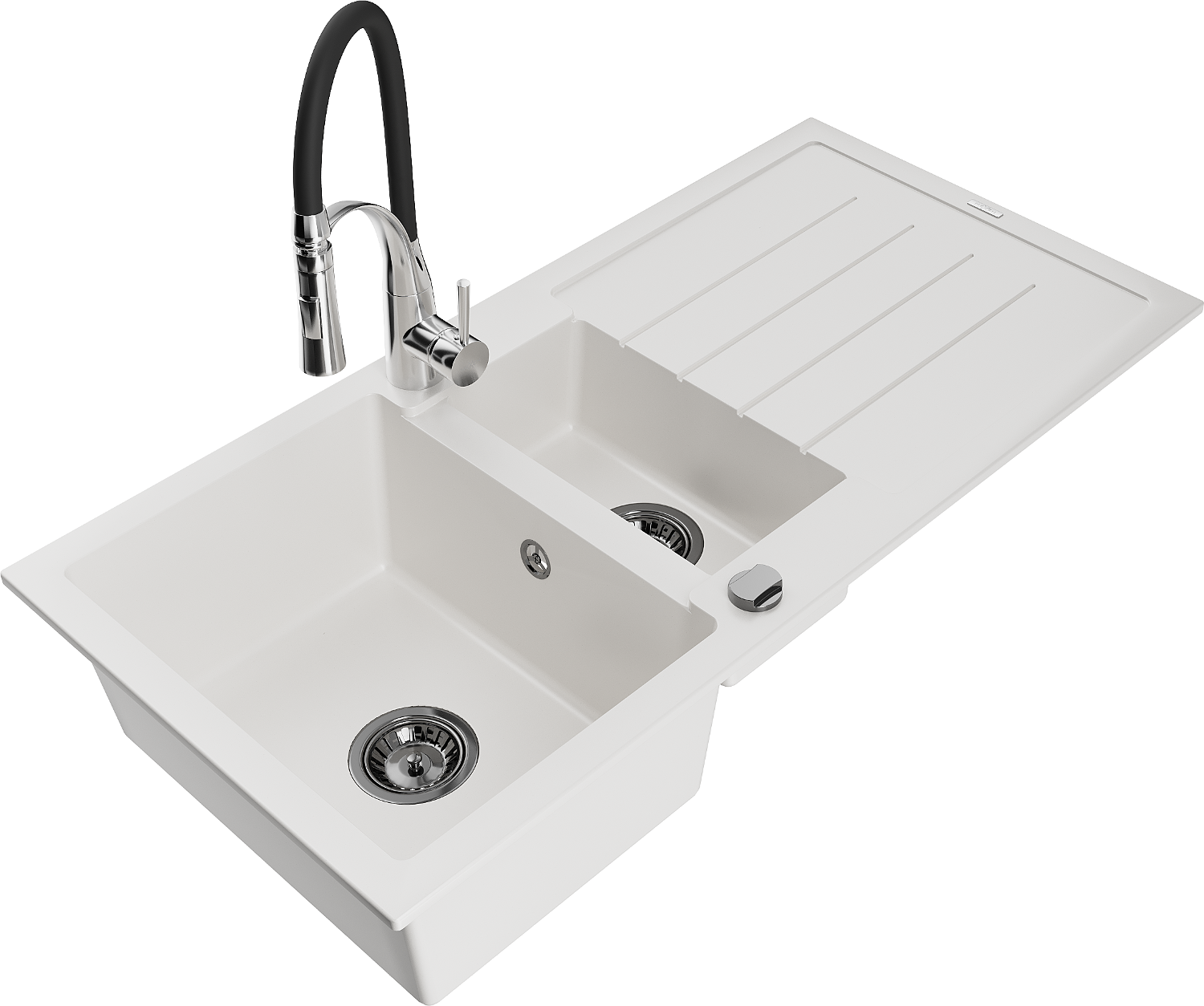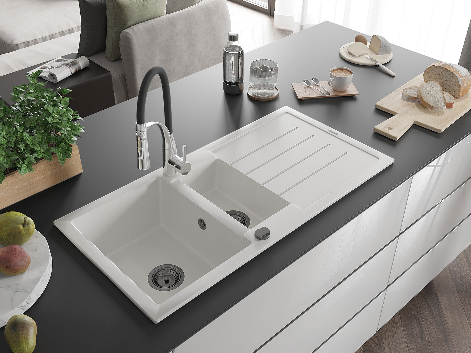 Mexen Andres zlewozmywak granitowy 1,5-komorowy z ociekaczem i baterią kuchenną Aster, biały - 6515-20-73450-07-B