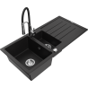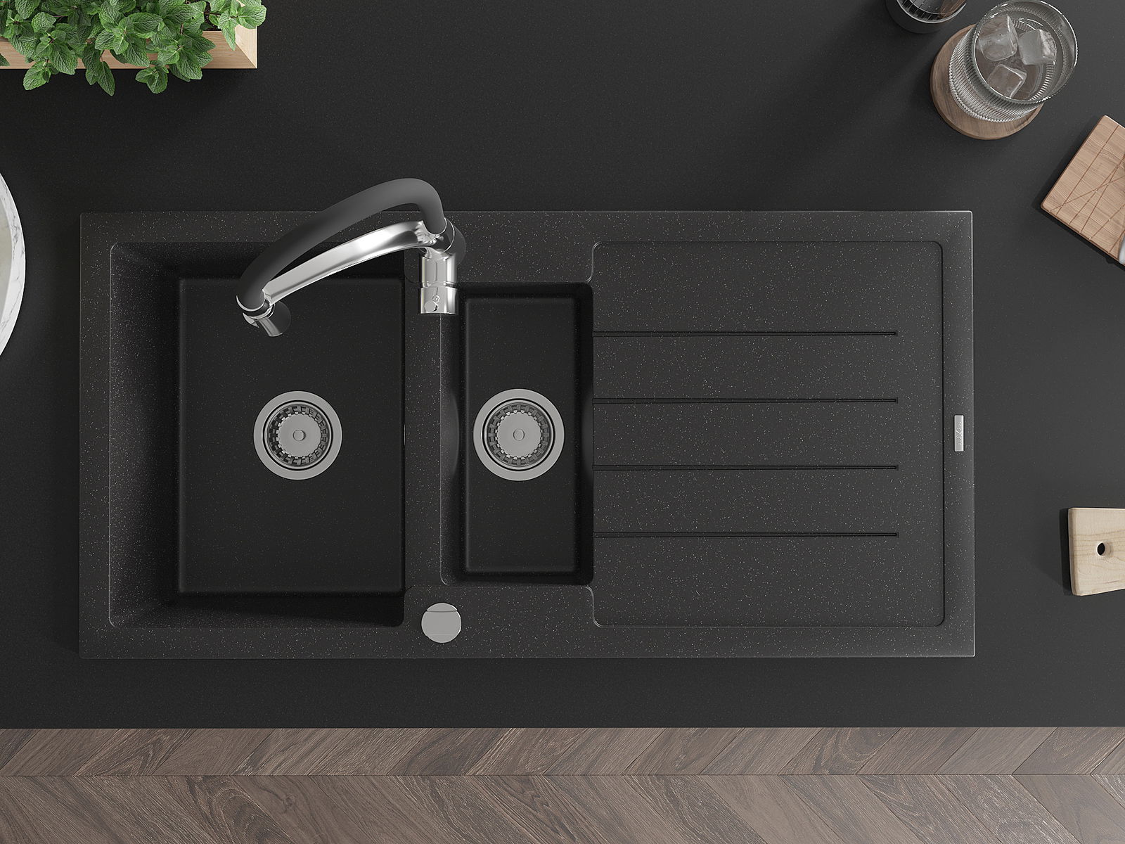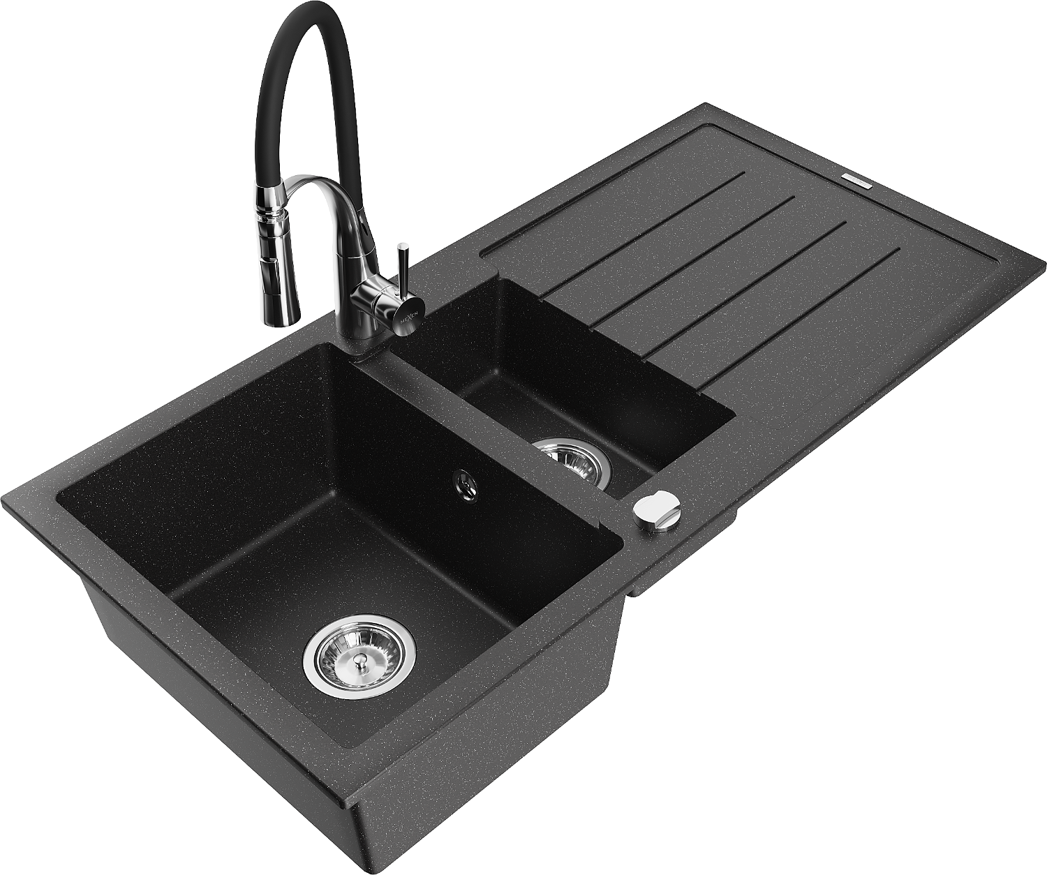 Mexen Andres zlewozmywak granitowy 1,5-komorowy z ociekaczem i baterią kuchenną Aster, czarny/srebrny metalik - 6515-73-73450-07