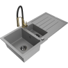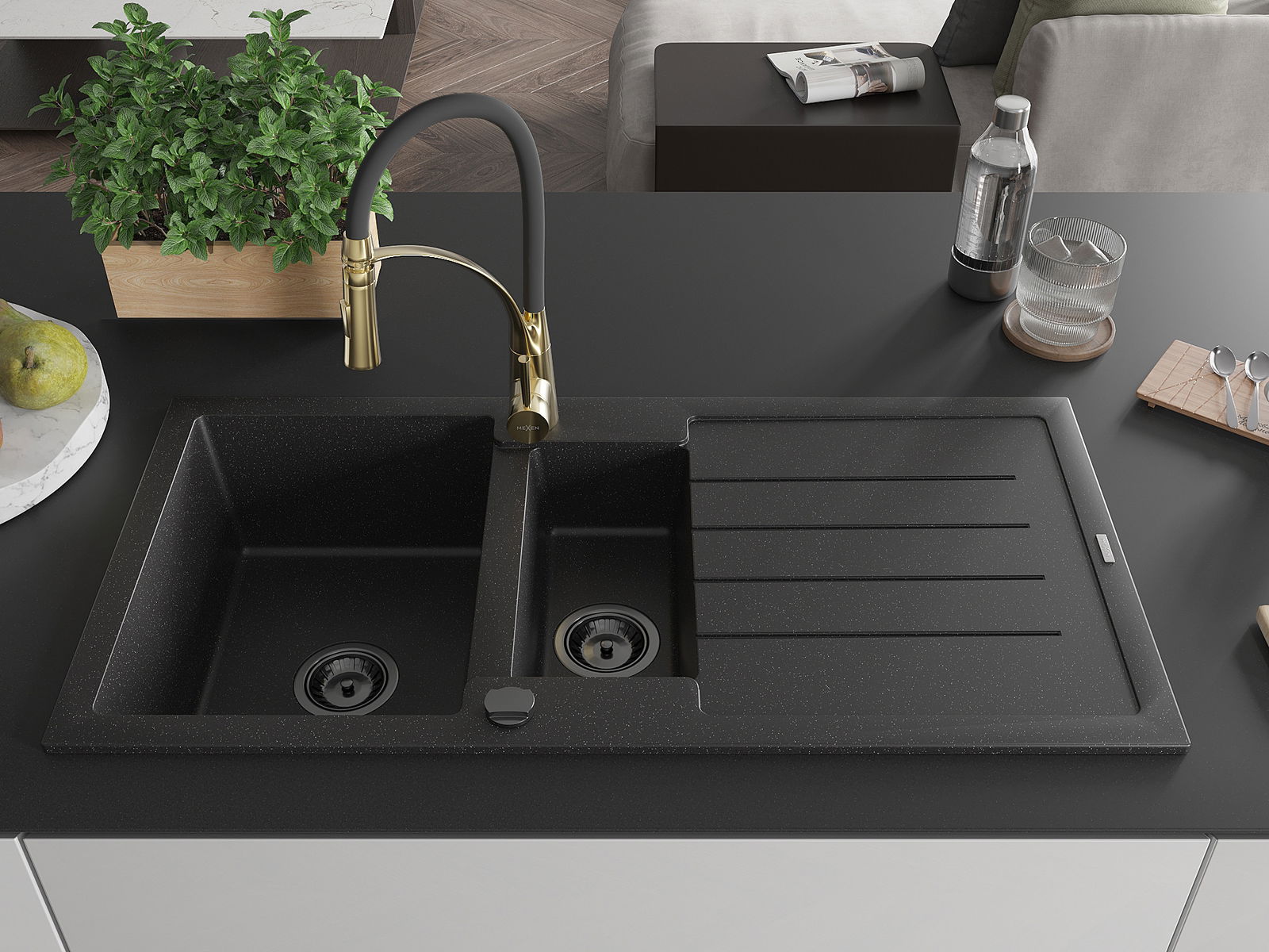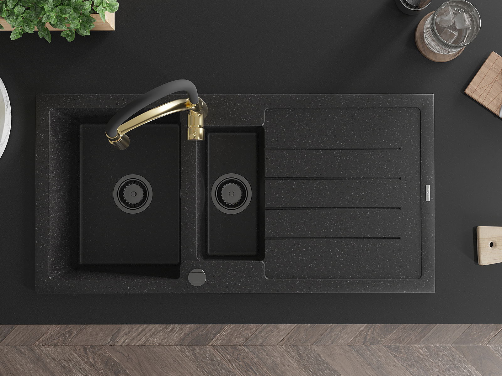 Mexen Andres zlewozmywak granitowy 1,5-komorowy z ociekaczem i baterią kuchenną Aster, czarny/srebrny - 6515-73-73450-57-B