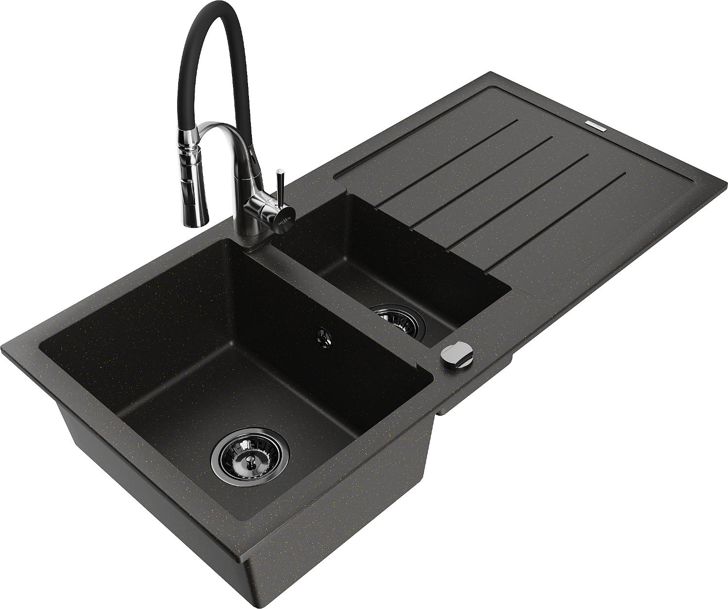 Mexen Andres zlewozmywak granitowy 1,5-komorowy z ociekaczem i baterią kuchenną Aster, czarny/złoty metalik - 6515-75-73450-07-B