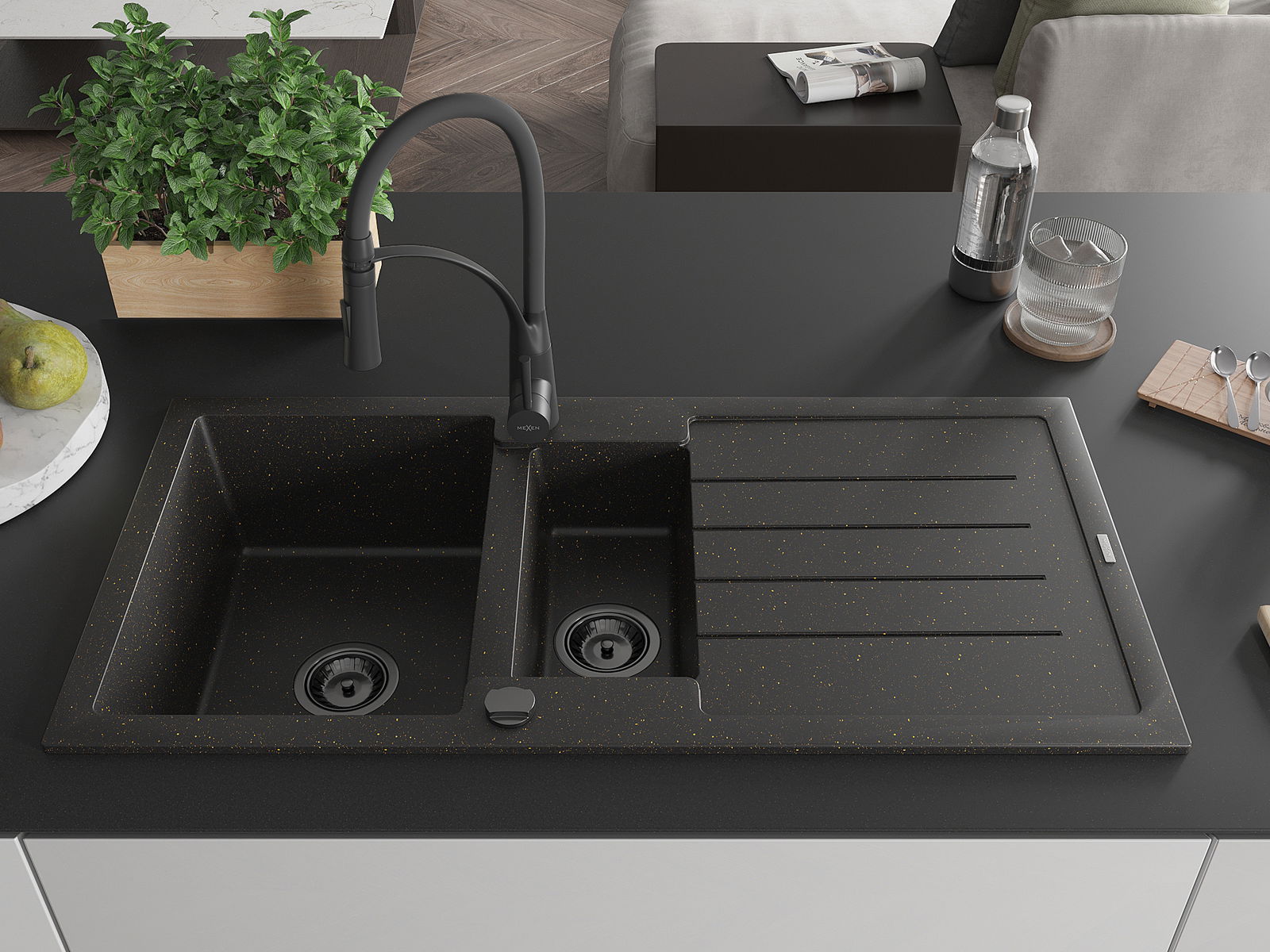 Mexen Andres zlewozmywak granitowy 1,5-komorowy z ociekaczem i baterią kuchenną Aster, czarny/złoty metalik - 6515-75-73450-70-B