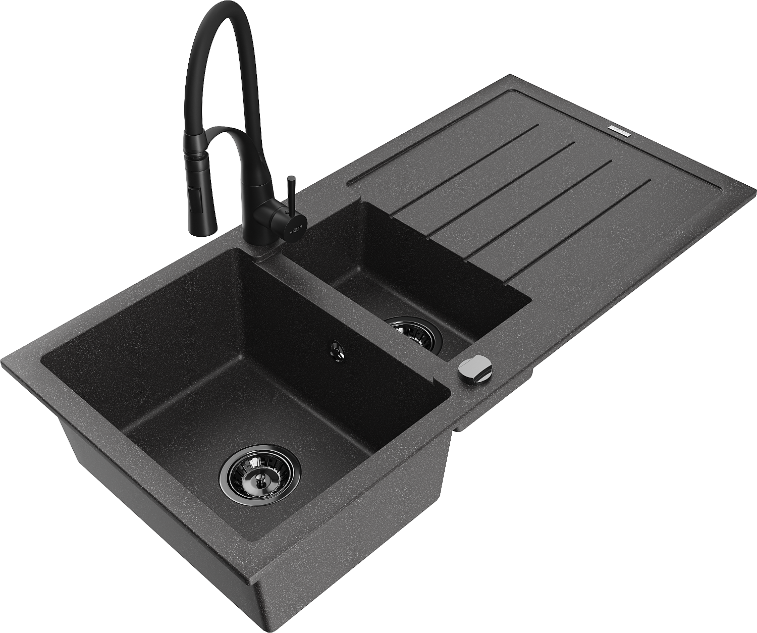 Mexen Andres zlewozmywak granitowy 1,5-komorowy z ociekaczem i baterią kuchenną Aster, czarny nakrapiany - 6515-76-73450-70-B