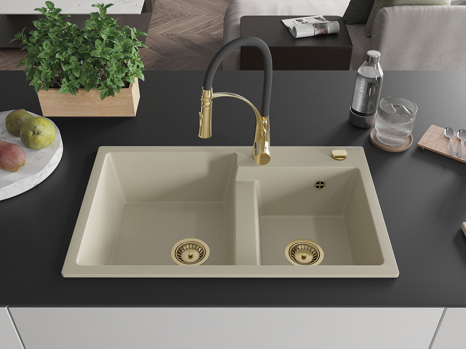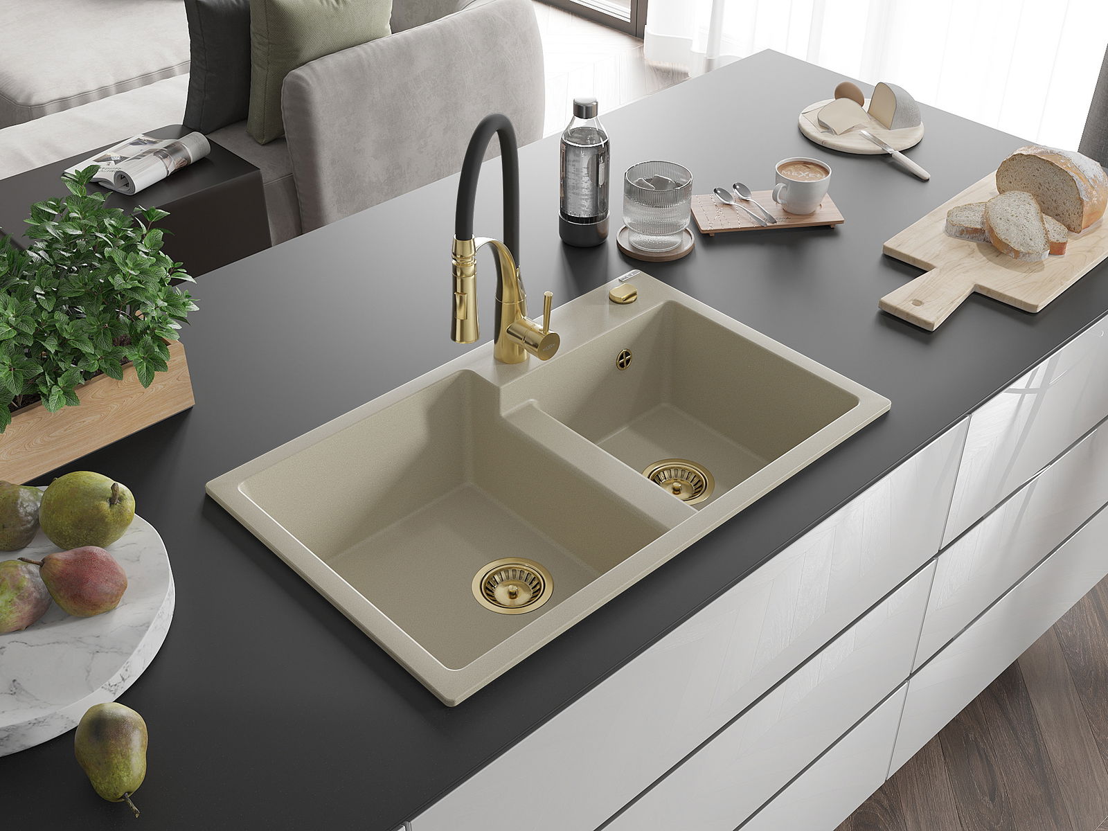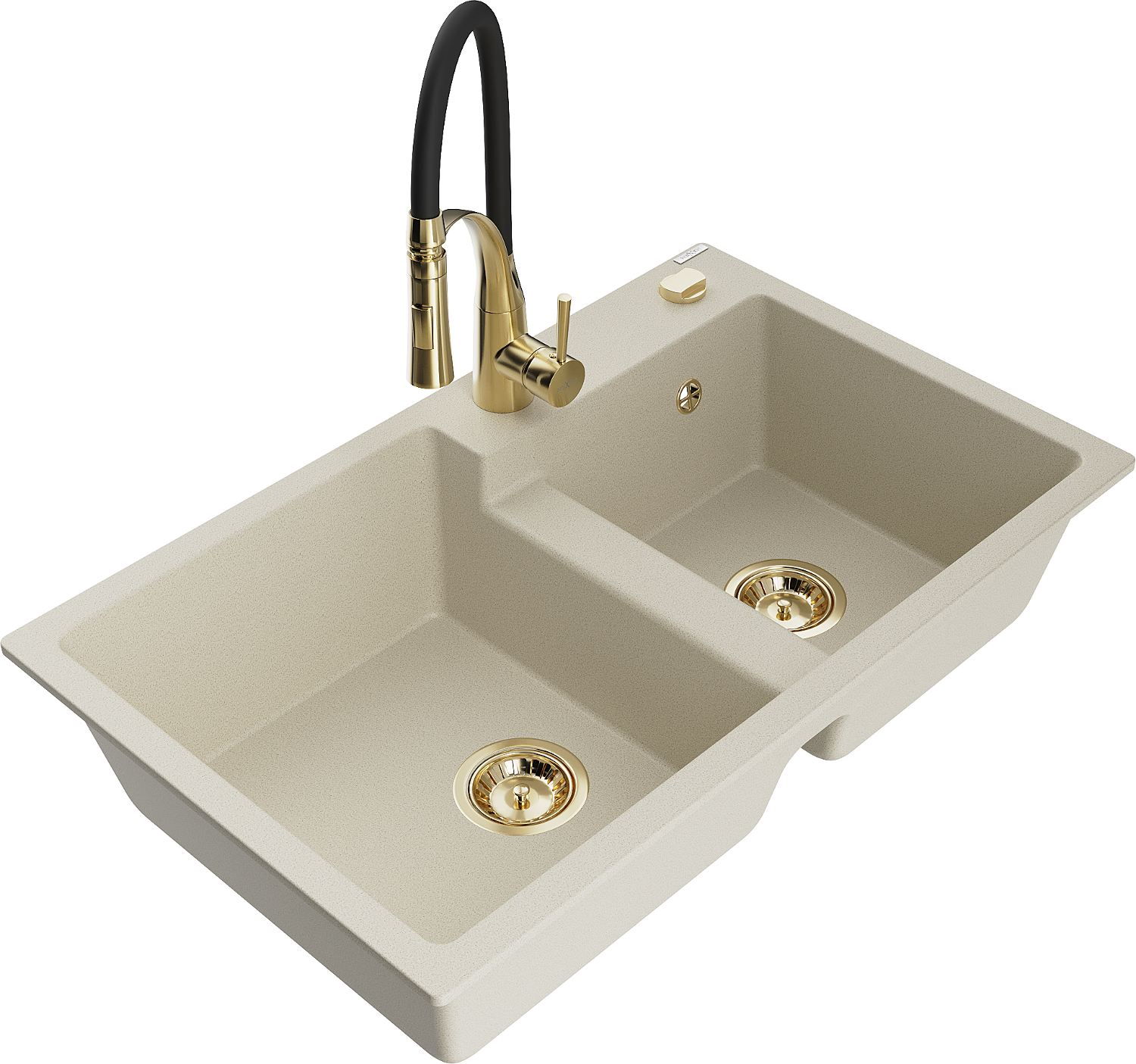 Mexen Tomas zlewozmywak granitowy 2-komorowy z baterią kuchenną Aster, beżowy - 6516-69-73450-57-G