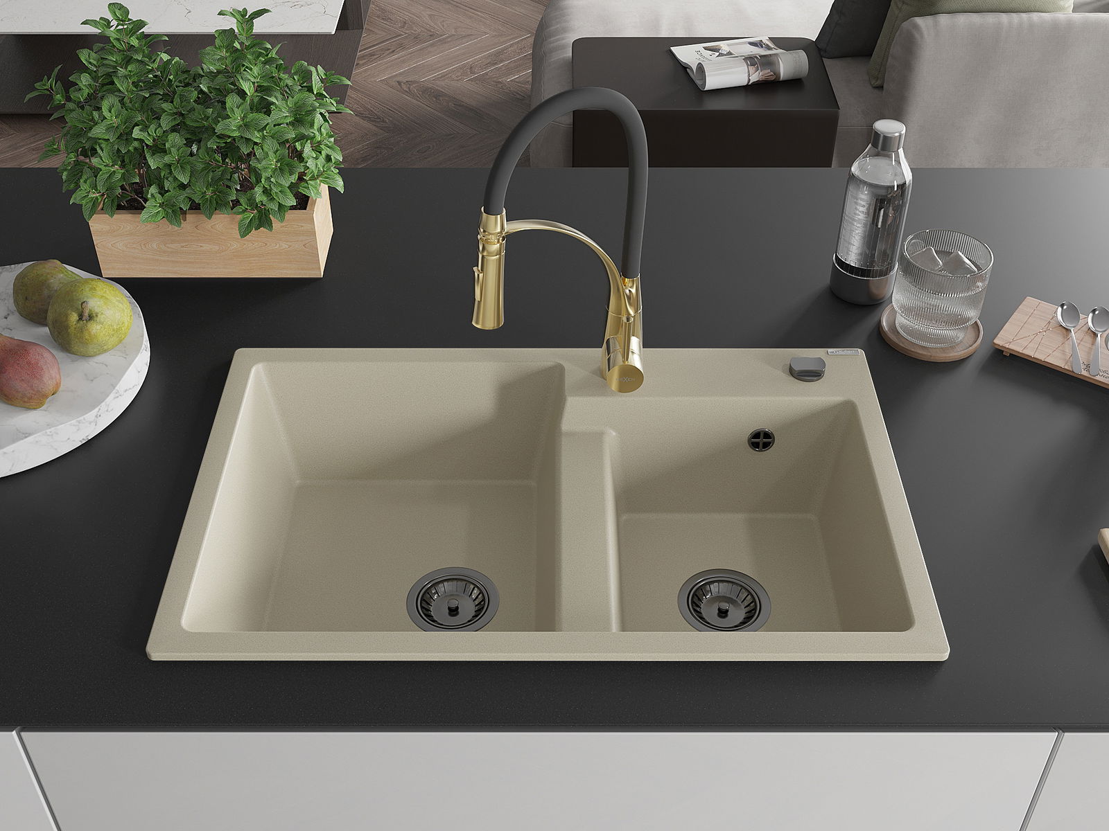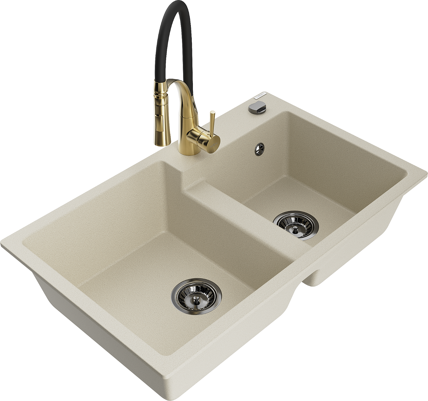 Mexen Tomas zlewozmywak granitowy 2-komorowy z baterią kuchenną Aster, beżowy - 6516-69-73450-57-B