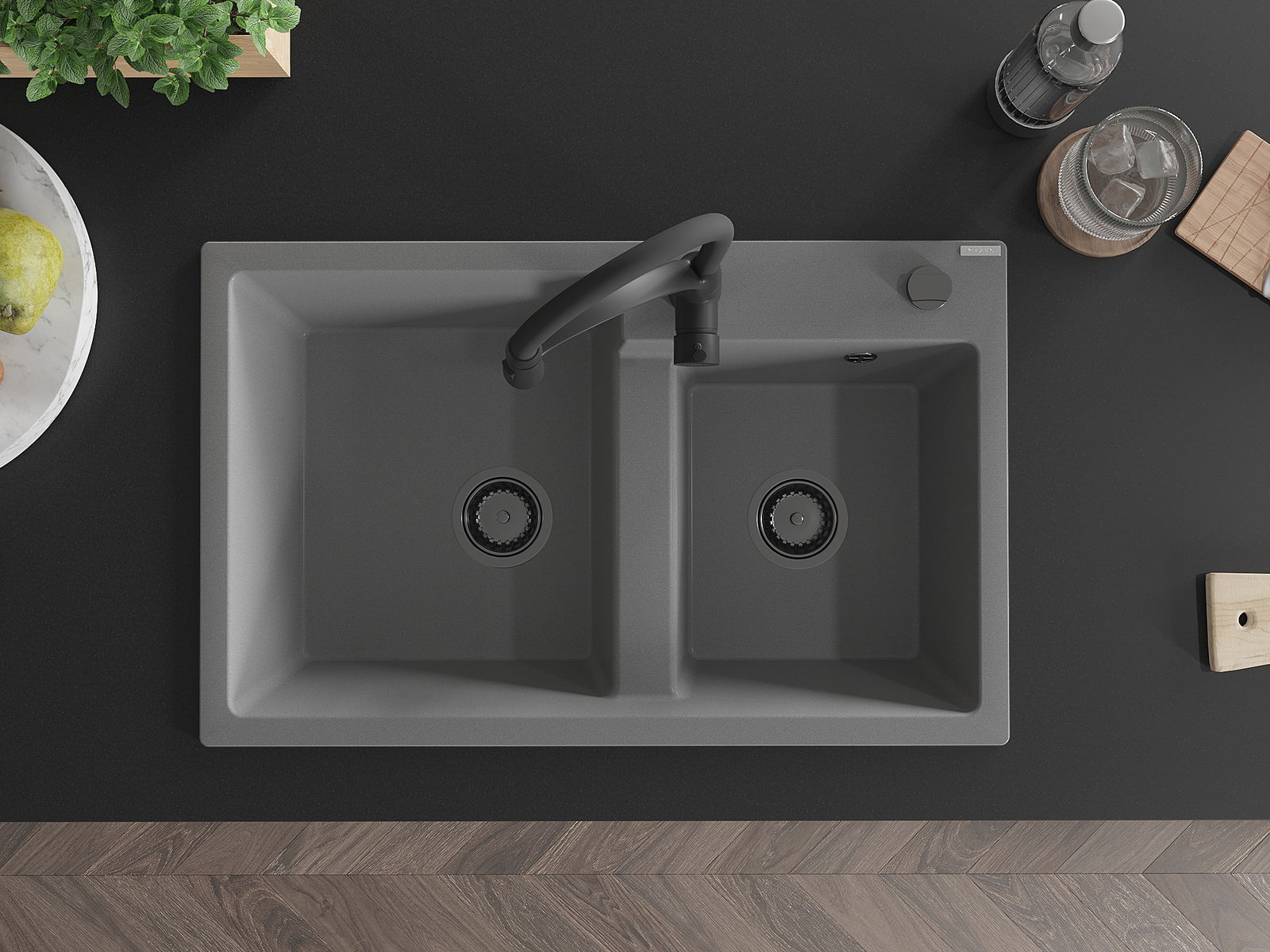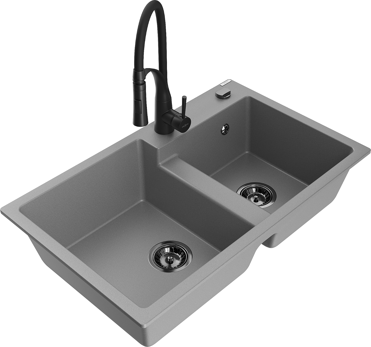 Mexen Tomas zlewozmywak granitowy 2-komorowy z baterią kuchenną Aster, szary - 6516-71-73450-70-B