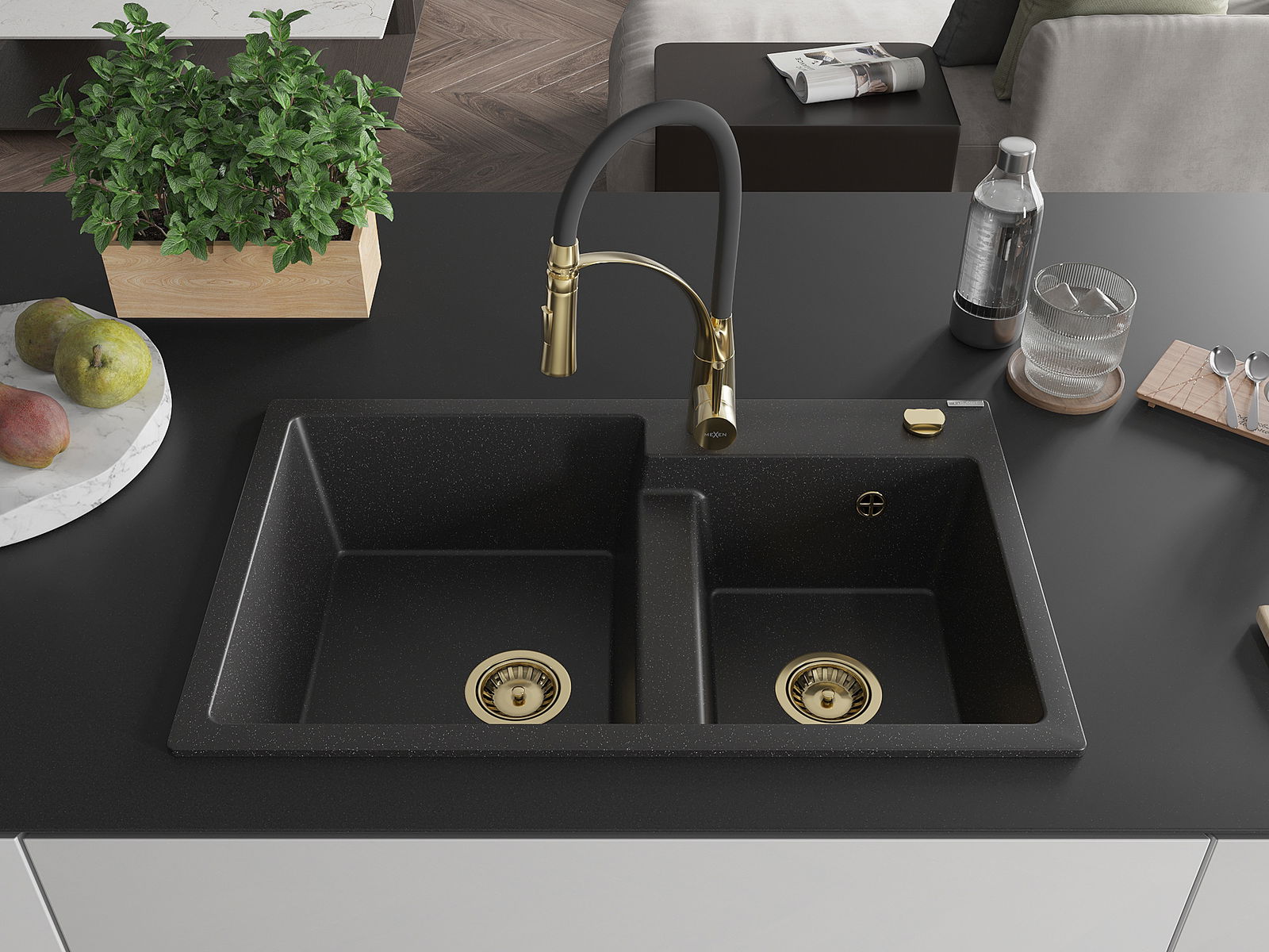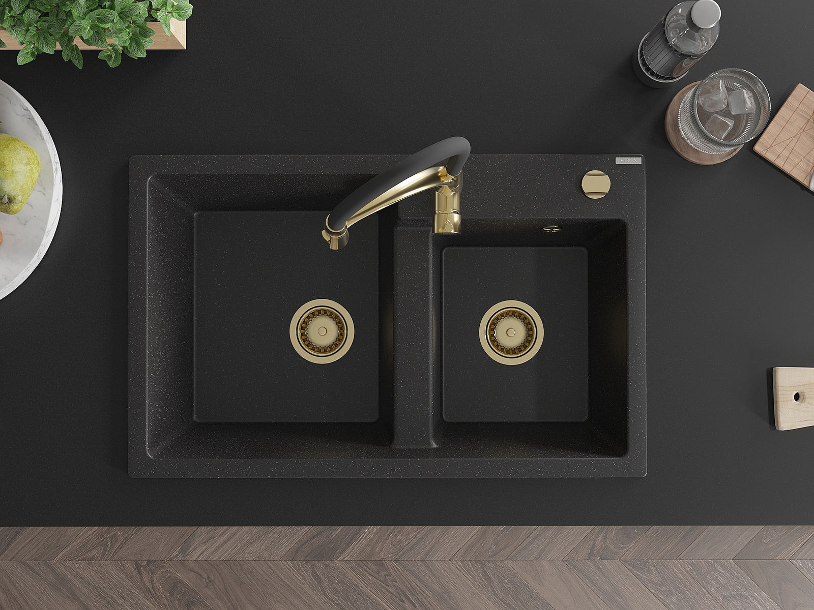 Mexen Tomas zlewozmywak granitowy 2-komorowy z baterią kuchenną Aster, czarny/srebrny metalik - 6516-73-73450-57-G