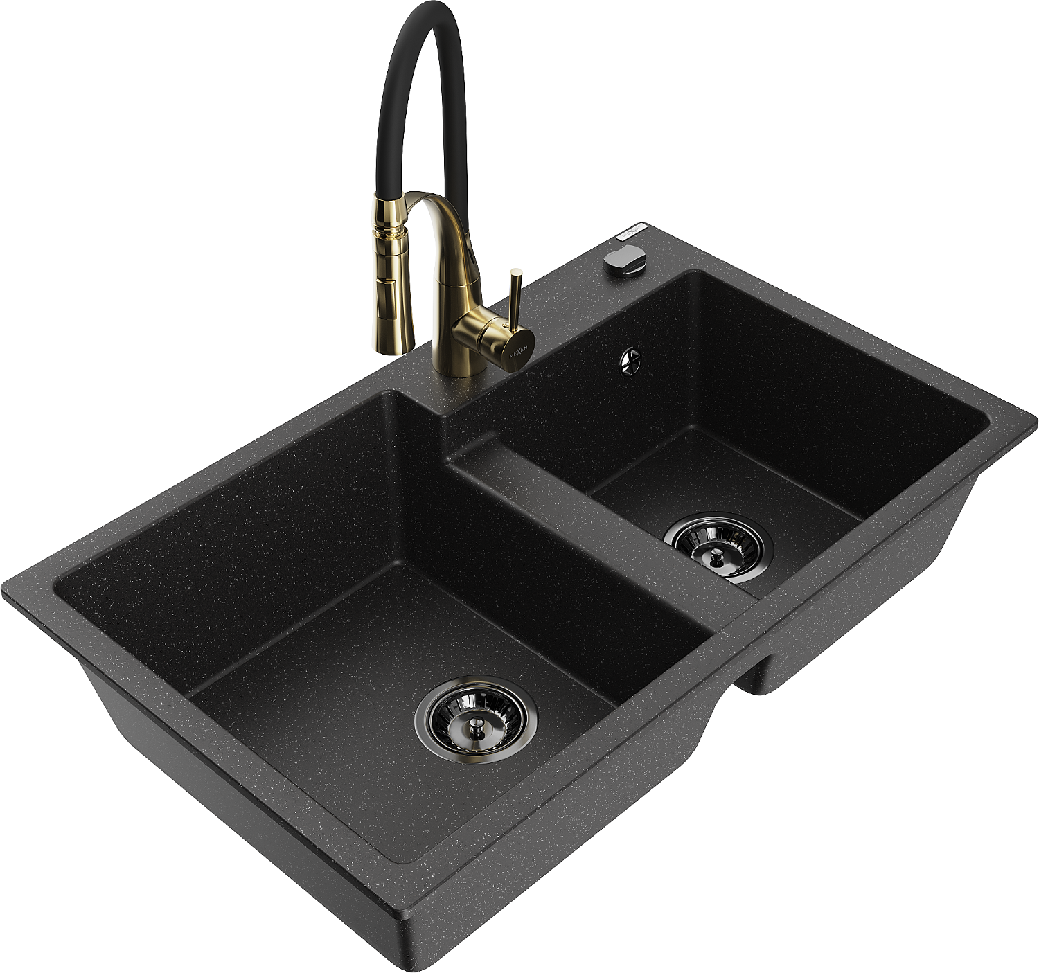 Mexen Tomas zlewozmywak granitowy 2-komorowy z baterią kuchenną Aster, czarny/srebrny metalik - 6516-73-73450-57-B