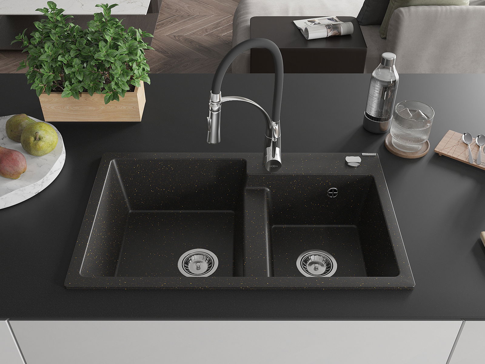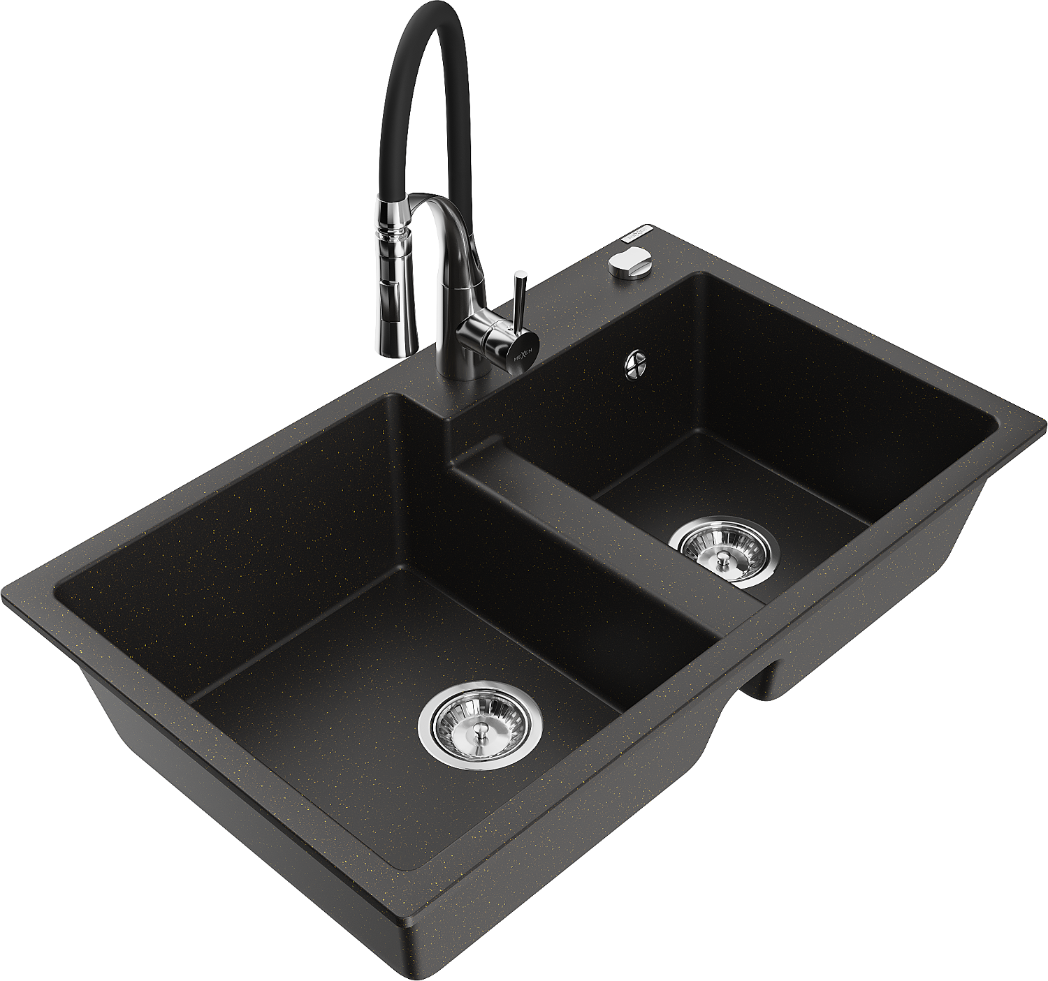Mexen Tomas zlewozmywak granitowy 2-komorowy z baterią kuchenną Aster, czarny/złoty metalik - 6516-75-73450-07