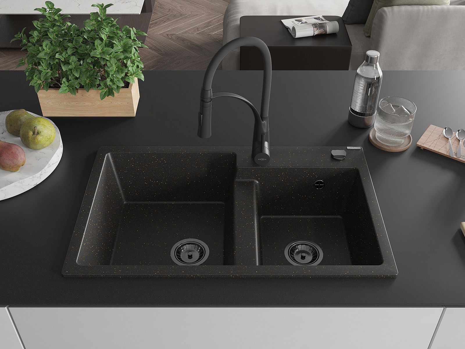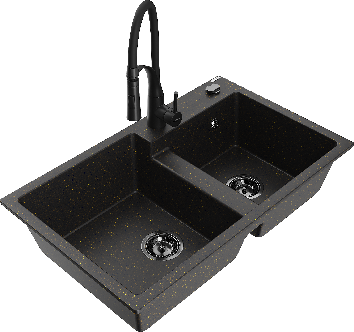 Mexen Tomas zlewozmywak granitowy 2-komorowy z baterią kuchenną Aster, czarny/złoty metalik - 6516-75-73450-70-B