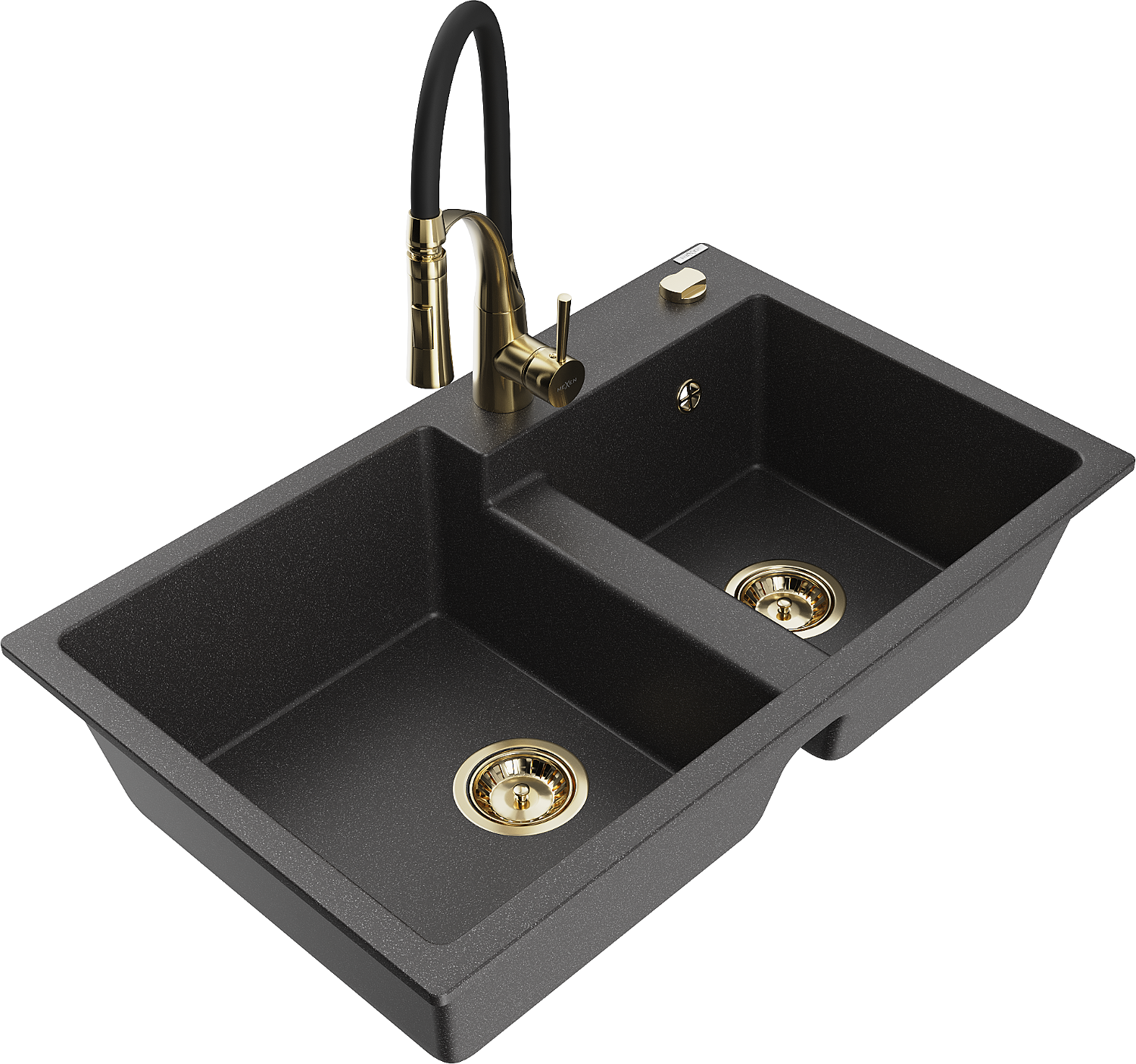 Mexen Tomas zlewozmywak granitowy 2-komorowy z baterią kuchenną Aster, czarny nakrapiany - 6516-76-73450-57-G