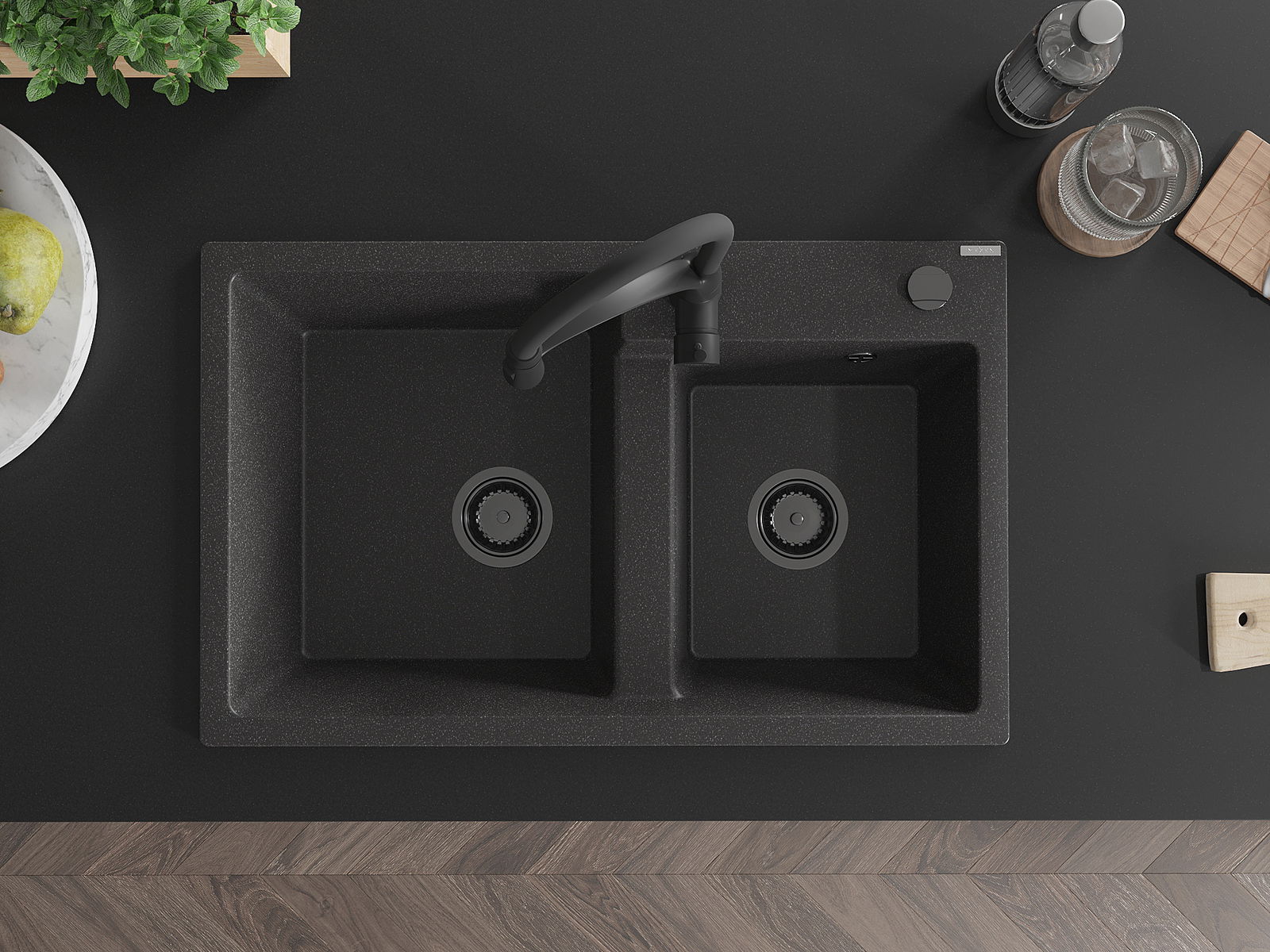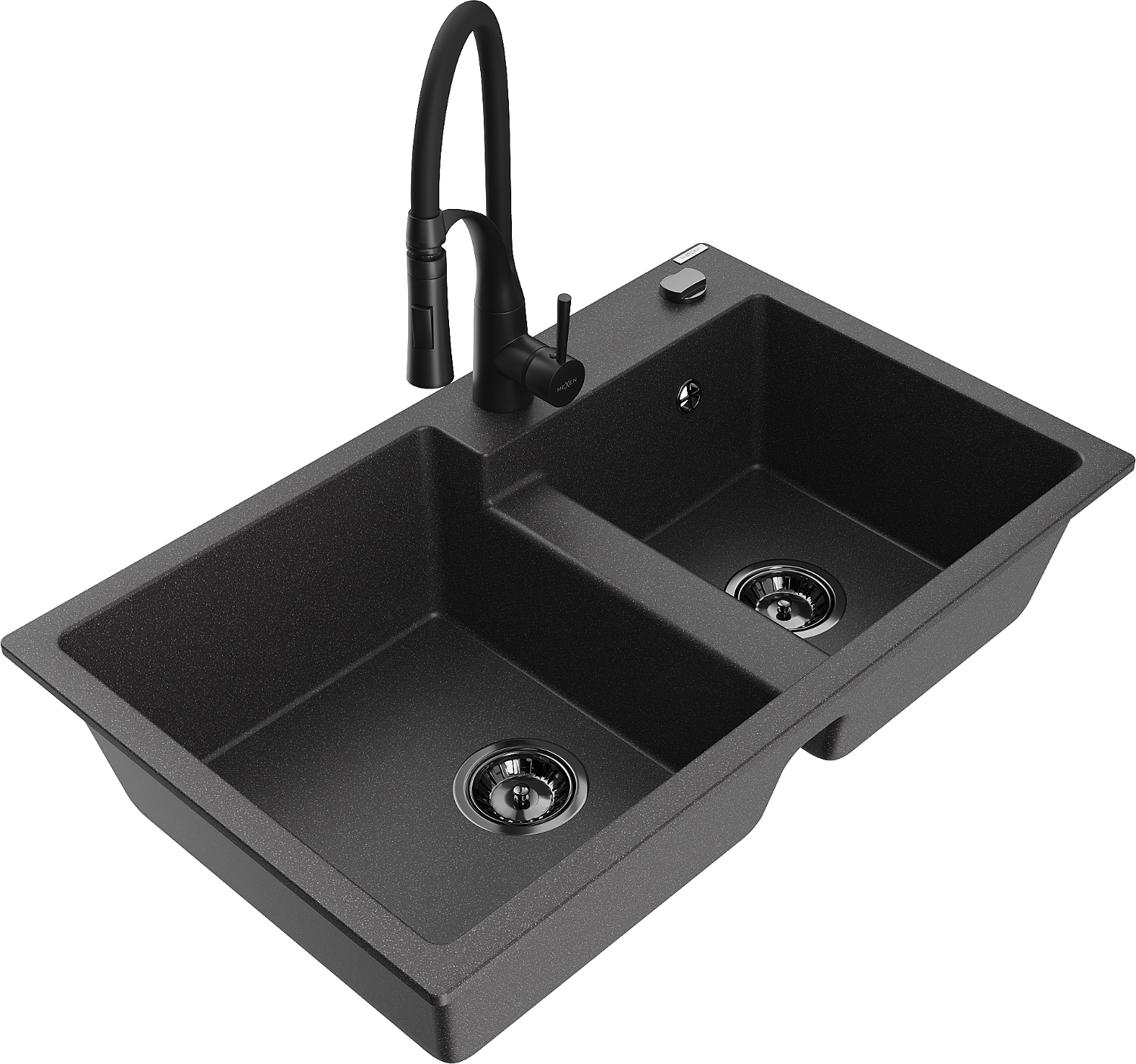 Mexen Tomas zlewozmywak granitowy 2-komorowy z baterią kuchenną Aster, czarny nakrapiany - 6516-76-73450-70-B