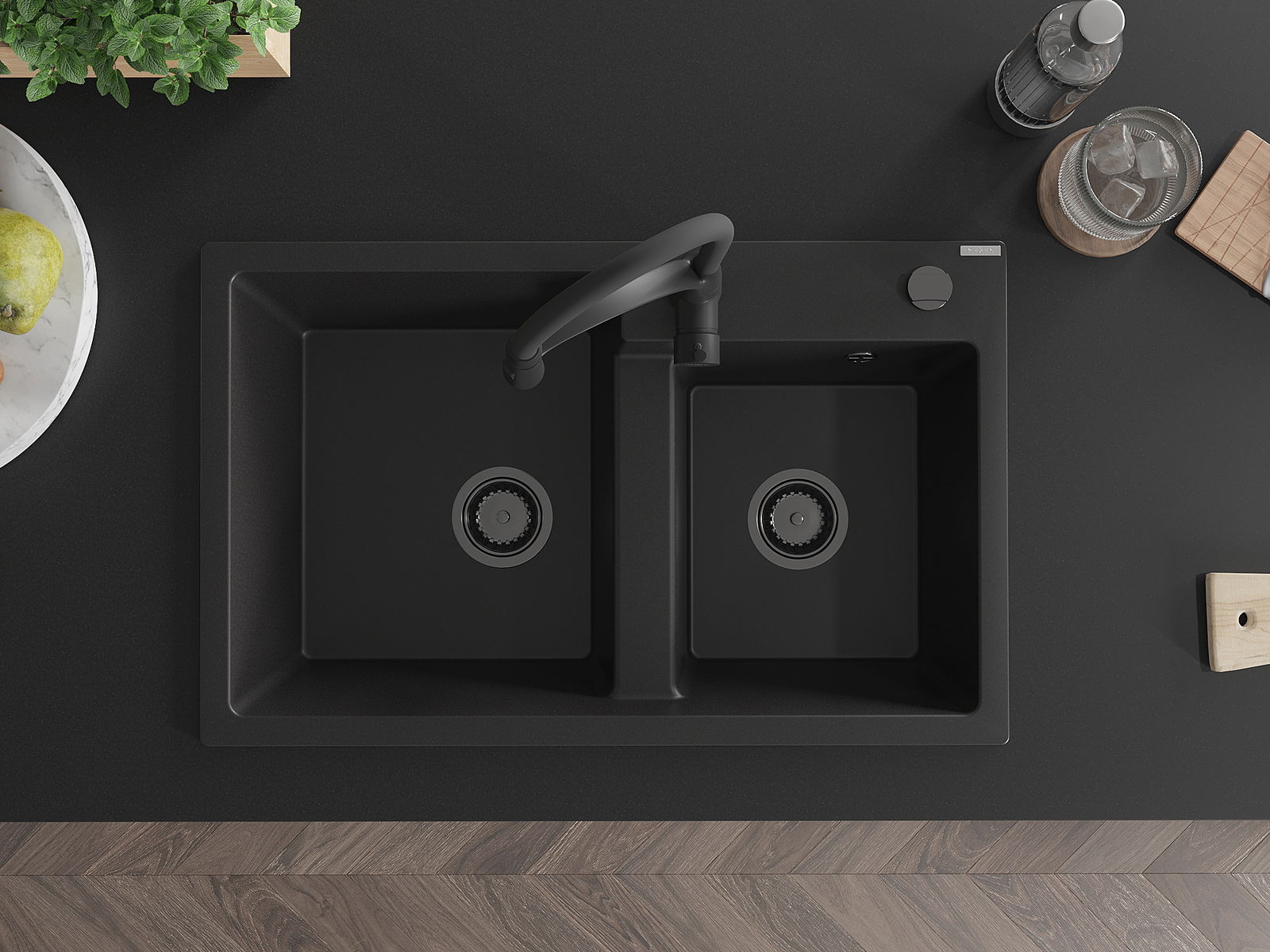 Mexen Tomas zlewozmywak granitowy 2-komorowy z baterią kuchenną Aster, czarny - 6516-77-73450-70-B