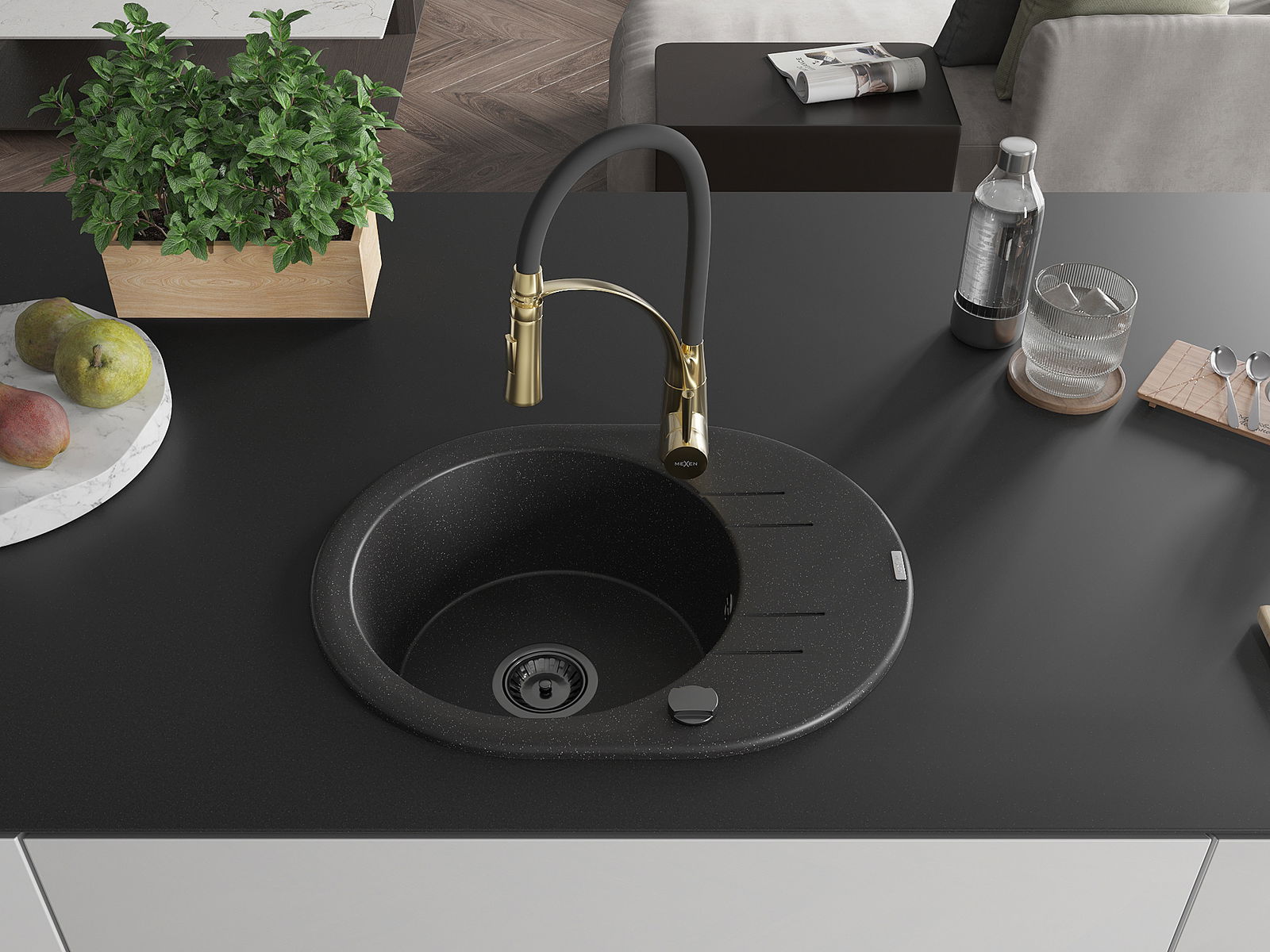 Mexen Kevin zlewozmywak granitowy 1-komorowy z ociekaczem i baterią kuchenną Aster, czarny/srebrny metalik - 6517-73-73450-57-B
