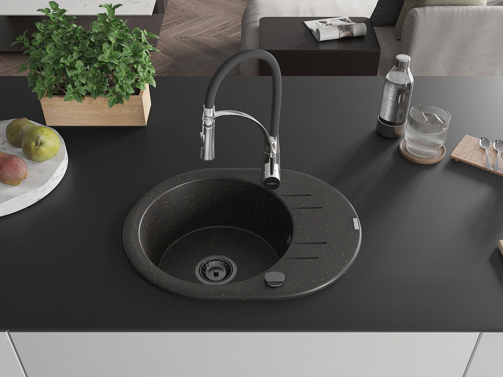 Mexen Kevin zlewozmywak granitowy 1-komorowy z ociekaczem i baterią kuchenną Aster, czarny/złoty metalik - 6517-75-73450-07-B