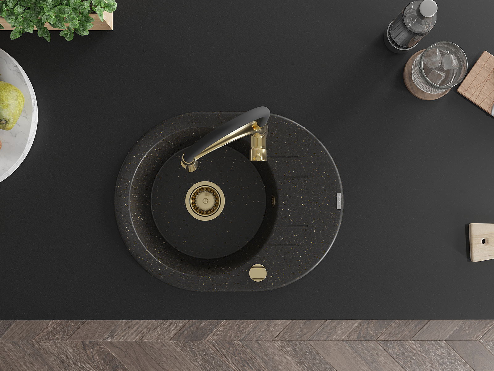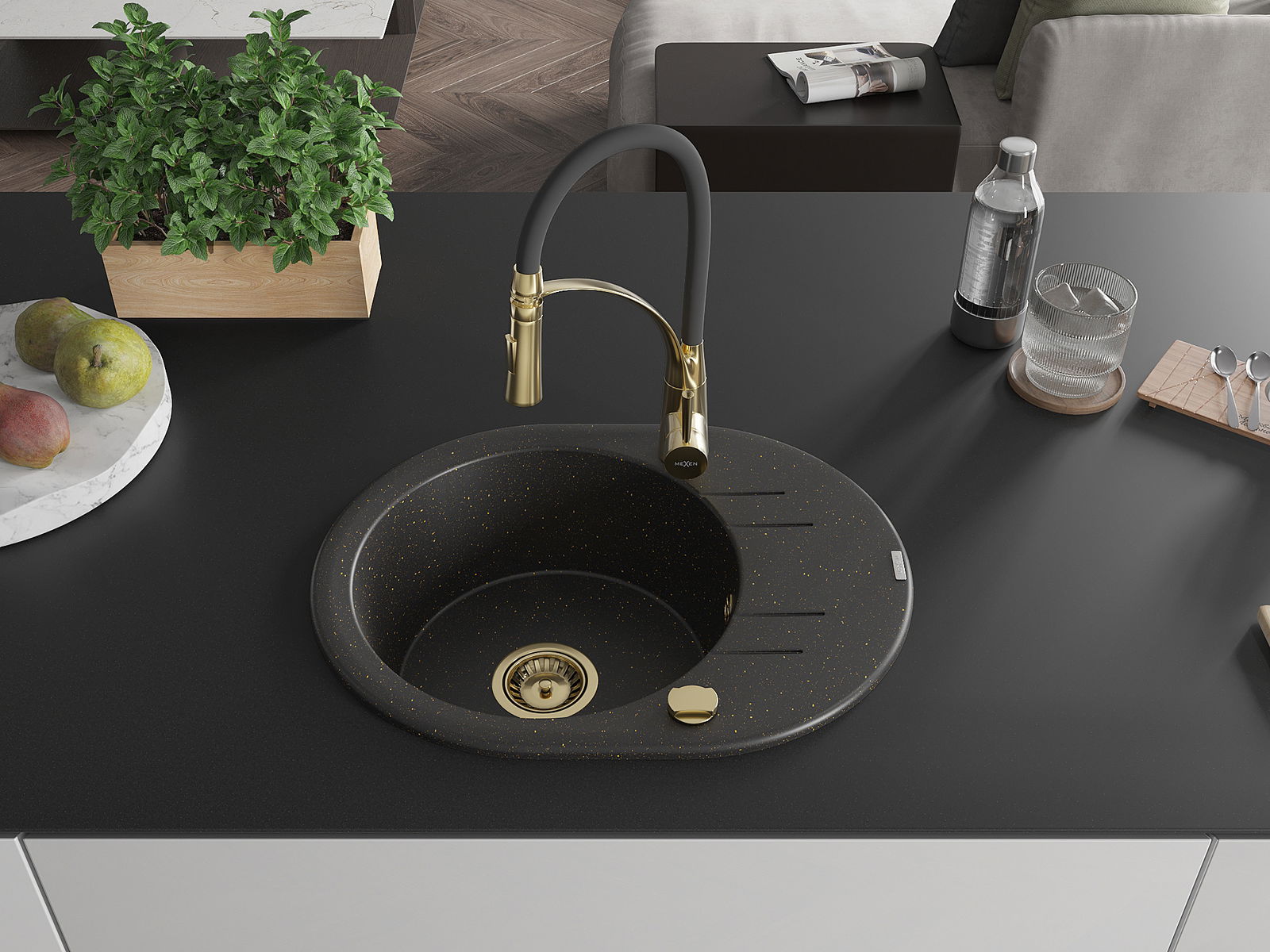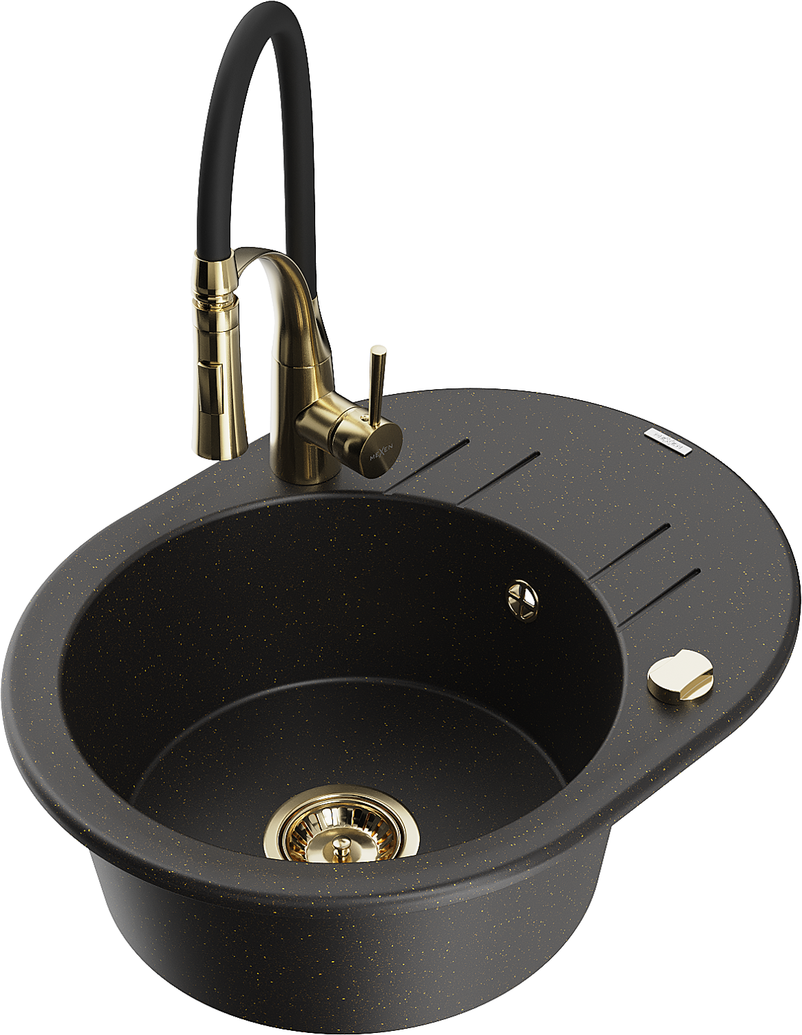 Mexen Kevin zlewozmywak granitowy 1-komorowy z ociekaczem i baterią kuchenną Aster, czarny/złoty metalik - 6517-75-73450-57-G